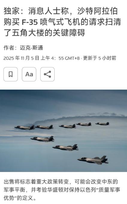 路透社:沙特购买F35战机扫清障碍! 沙特早些时候提出购买F35战机的需求,美国也在一直权衡出售48架F35战机的可能性。截至目前的中东地区,唯一拥有F35战机的武装力量,是以色列空军。一旦沙特买了F35战机战机,那么实力稍微上涨一些,也是正常的。沙特买歼35A战机的可能性,又降低了些。 这种F35战机关键武器的采购,不是简单的商业买卖,买美国的东大不会干预,但是买东大歼35A战机,美国不会同意,因为沙特王子的执政权,都有可能被推翻。 沙特这样的王权国家,存在的第一要素,就是要保证沙特王室的统治权。如果大家不理解的话,就可以参考一下满清末年的爱新觉罗家族,他们为了延续统治,是可以出卖任何利益的,只要他们还是皇族,就不管出卖多少利益,都可以都会答应。 而沙特王室也是这样,他们也是为了保证沙特王室的延续,谁实力强大就靠向谁,所以美国在中东地区仍然强大。那么沙特继续购买美国战机的想法,大家就可以理解了。不管怎么说,F35战机是不是厉害?沙特不管,沙特只管买,给了保护费,给美国让美国保护沙特,那就行了。 毕竟大家可以看到美国,是有实力在任何中东国家,掀起一个新的颜色革命,所以沙特王室必须要和美国搞好关系,给美国送钱送资产,都应该的,必须要保证沙特王室的延续。如果沙特王室不听话,那么美国和以色列是真的有能力,在沙特掀起一场新的变化。 比如叙利亚、利比亚等国,都是在各种情况下,变换了执政人员,现在都是听美国的话。所以沙特王室的操作,各位要理解,人家就是需要保护。