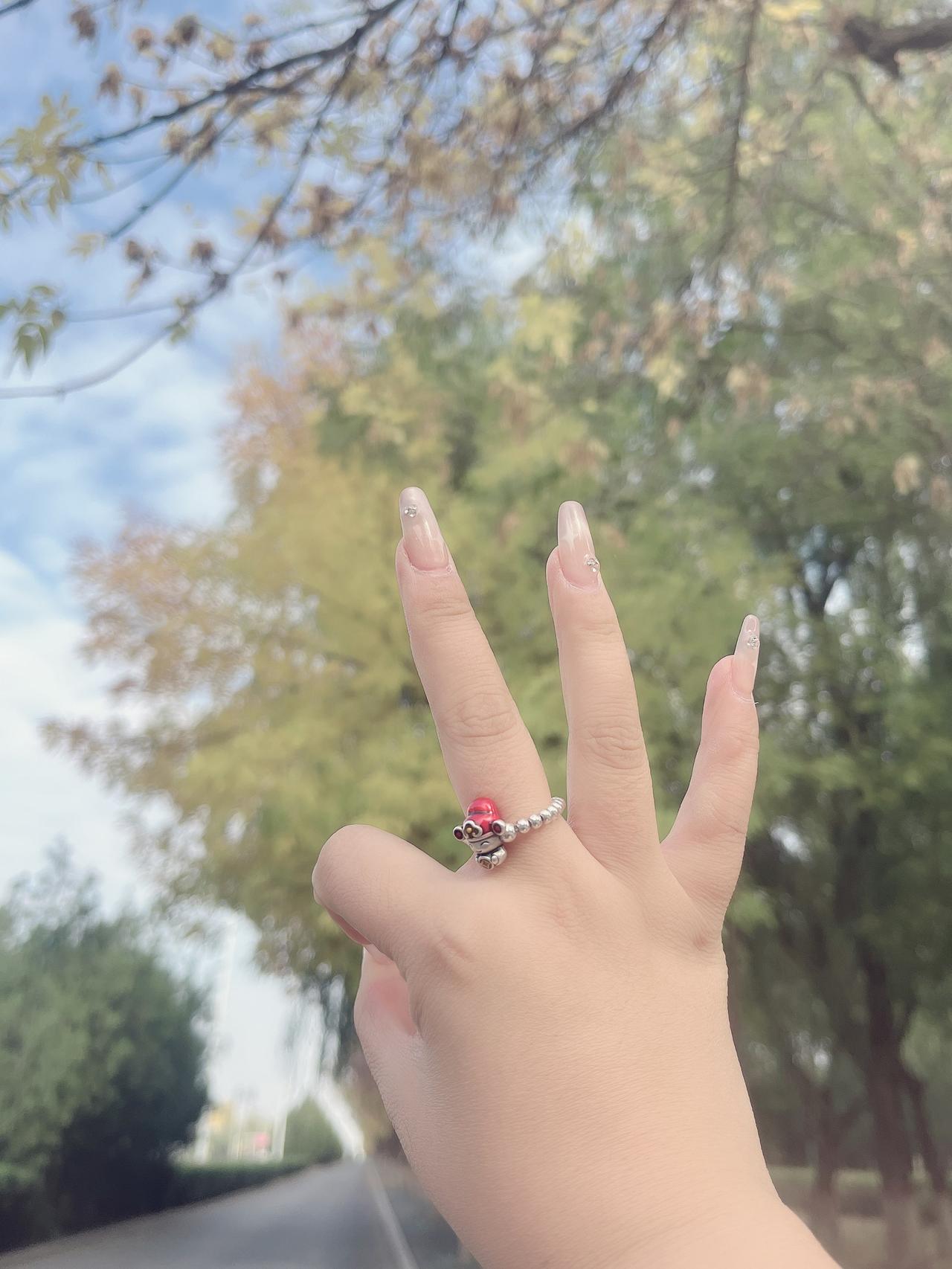 秋日遛弯的松弛感:从指尖到空气都在发光✨ 秋天的风一裹,连随手拍都自带滤镜——今天揣着半杯热拿铁出门,没想到被路人连问了两样“小心机”:裸透美甲+蘑菇戒指。 美甲选了清透的裸色打底,指尖缀了两颗碎钻,像把秋日的阳光揉进指甲缝里,低调又闪得刚好;戒指是银链+红顶小蘑菇,软乎乎的立体造型,把童话感揣在了手心里。 其实秋天的松弛感从来不是“用力打扮”:穿件oversize的米白针织衫,配条垂感阔腿裤,再用这些小物件戳破沉闷——美甲的透、戒指的俏,和路边半黄的树叶一搭,连风都变得软乎乎的。 走在路上的时候,风裹着桂花香往袖子里钻,抬手看戒指的时候,突然觉得:生活的甜,就是这些不用费力气的“刚好”啊~