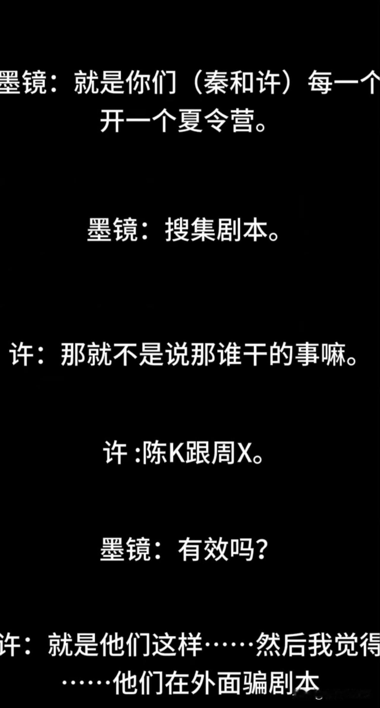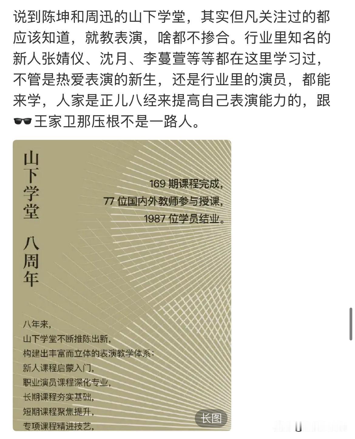 11月8日,王家卫录音蛐蛐名单➕2! 王家卫想让秦雯办夏令营搜集学员剧本,秦雯助理蛐蛐周迅陈坤,称他们办的山下学堂,就是在骗学生剧本,跟他们套路一样! 有一说一,其他的明星学堂可能不太了解,周迅陈坤这个因为杨超越停工进修演技就是去的那里,还真了解过一段时间,没听说她们还培养编剧,那里不是主修表演培训么? 周迅,陈坤也没有导演几部剧,几部电影,有必要特意办班去骗学员剧本么?秦雯助理这话不过是为了捧王家卫,为他的卑劣开脱