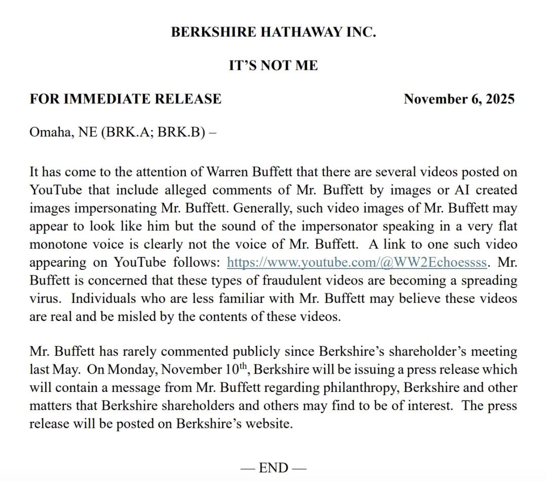 值得注意的是,该声明稿还透露,11月10日(周一),伯克希尔将发布一份新闻稿,其中将包含巴菲特关于慈善事业、伯克希尔及其他伯克希尔股东和相关人士可能感兴趣的事项的声明。