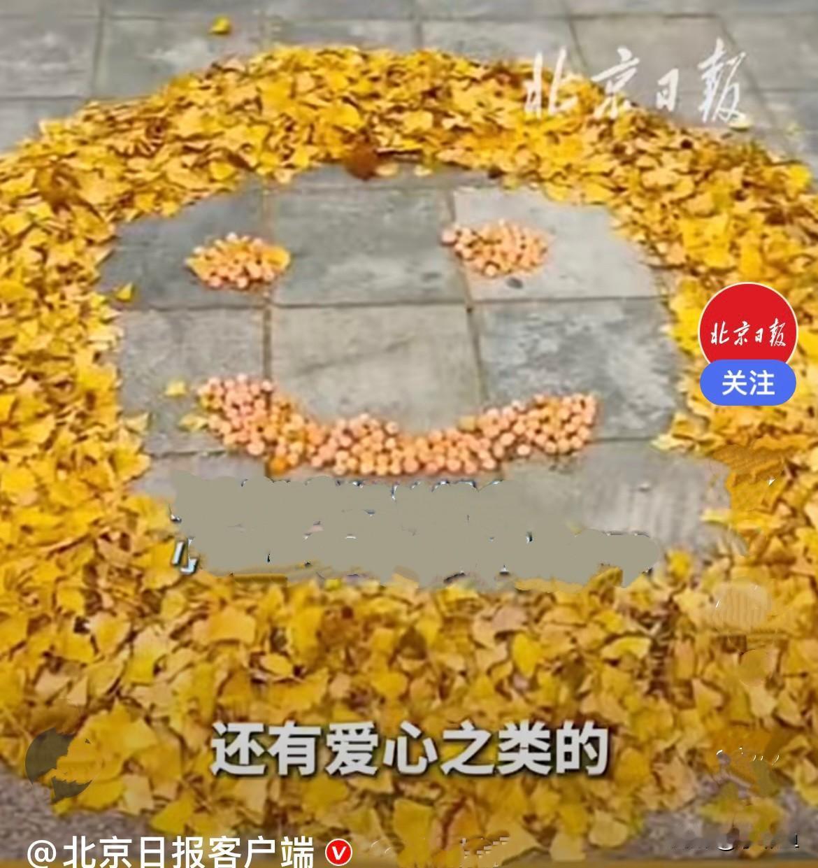 近日,大连外国语大学校园内的银杏树叶纷纷落地,金灿灿的漂亮极了,保洁阿姨把树叶扫在一起,扫成各种可爱的图案,有星星、有月亮,有爱心,还有笑脸,还把树叶粘在伞上,制作成银杏伞,用这种特殊的方式给同学们制造爱的浪漫,让爱延续下去…… 路过的学生也小心地不破坏这些爱的形状,真是双向奔赴的浪漫……