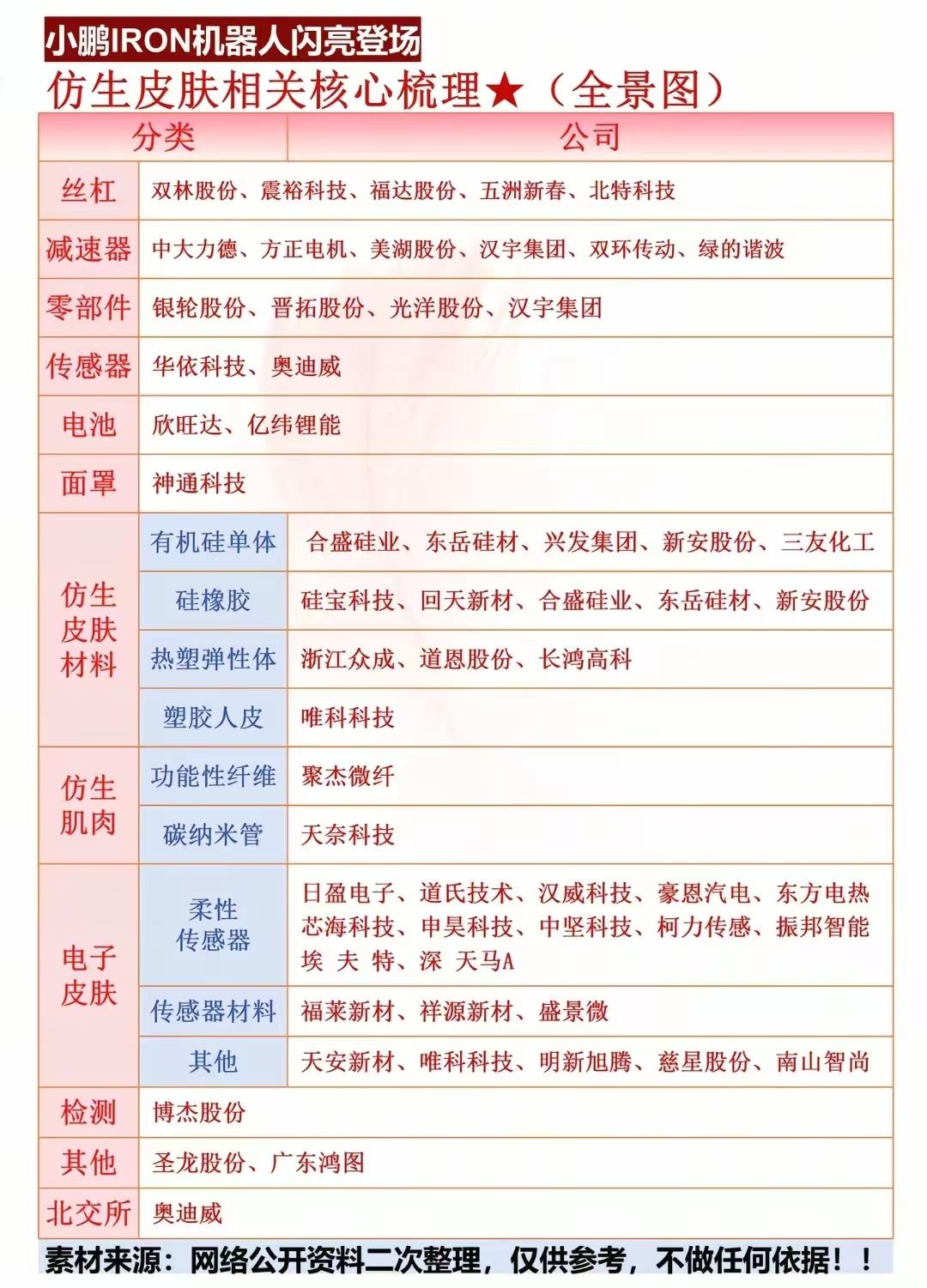 人形机器人题材新方向:仿生皮肤概念!(电子皮肤概念) 11月5点小鹏IRON机器人惊艳全网,其仿生皮肤技术备受关注!机器人仿生皮肤是让机器拥有类人感知的“智能外衣”,以柔性材料为基底,集成多模态传感器网络,能精准捕捉压力、温度、纹理甚至化学信号,既是人形机器人实现安全人机交互的核心,也是智能时代的“感知神经末梢”。相关产业链分类龙头代表有哪些? 机器人仿生皮肤材料龙头代表有道恩股份、合盛硅业;机器人仿生肌肉代表有天奈科技;电子皮肤龙头代表有福莱新材、日盈电子等等。资料取材网络仅供参考。 理财有风险入市需谨慎!