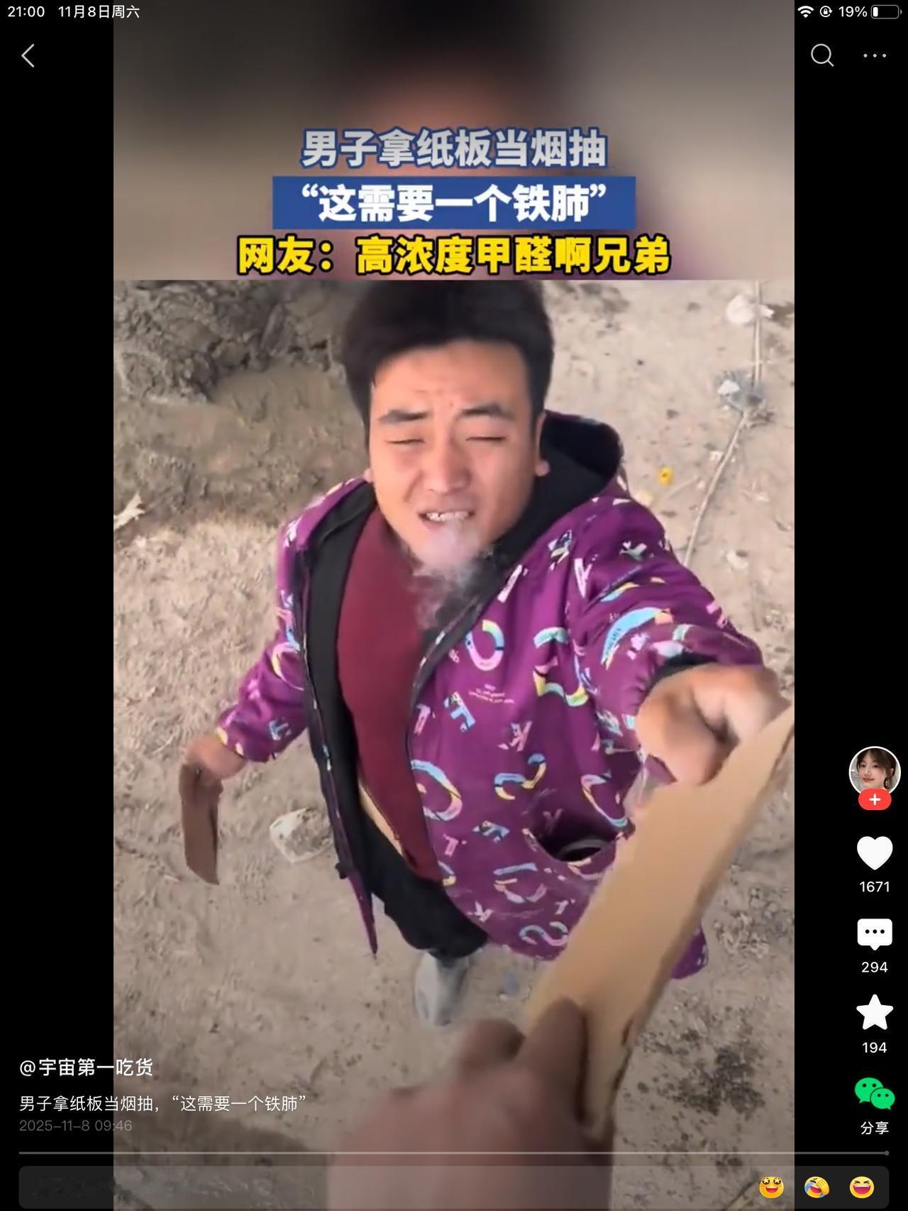 哥,你铁肺啊!求你了,别抽了。靠,这玩儿多脏啊!你听我的,你把那茄子叶卷吧卷吧,也能抽,那是植物的味道。 哥,你别抽了,我知道生活苦,你想冒个烟儿。你去云南捡点烟叶子抽,那老烟叶,农民都不要了。卖不上价钱。 哥,你多多上搜一下,还有自动卷烟的设备,很便宜。卷的很好。我小叔就抽这个。 哥,你这样,我哭了啊!我这周双休的,我懒得去上班。哥,你抽纸壳子,我下周不偷懒了哈!你这样教育我,代价太大了,哥!擦