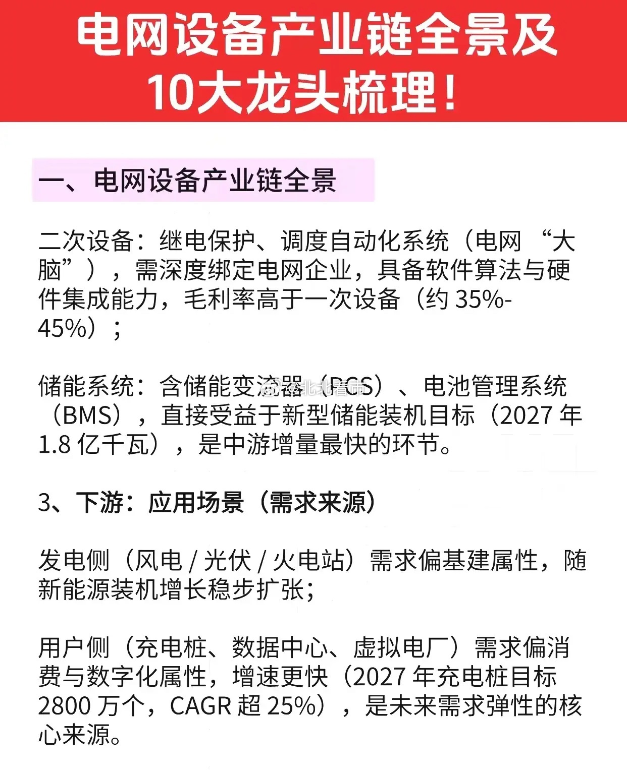 算力的尽头就是电力,电网设备是AI在能源领域落地的核心支撑。人工智能发展加剧全球电力供应压力,数据中心对能源使用质量要求提升,将带动配用电领域投资需求增长……想知道电网设备行业的投资逻辑和企业竞争力?这篇产业链全景+龙头梳理,带你一探究竟!