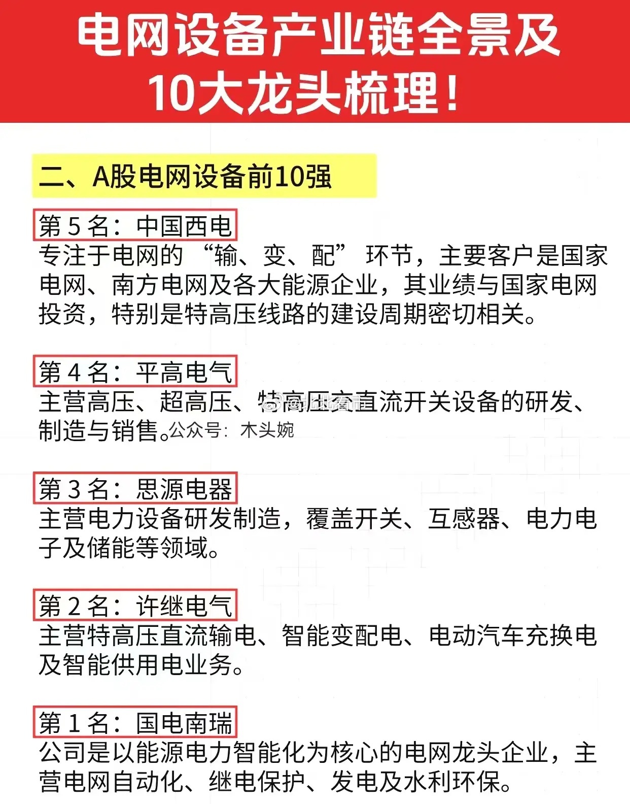中国西电是高压输配电设备制造业龙头,国电南瑞以能源电力智能化稳居榜首,许继电气在特高压直流输电领域实力硬核,特变电工的变压器技术雄冠全球,东方电缆、中天科技在海缆赛道二分天下……