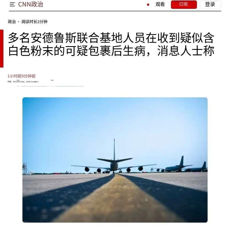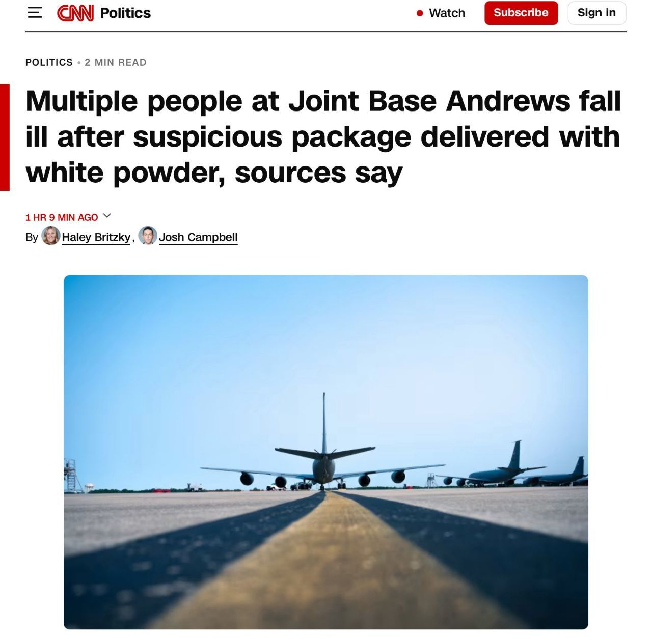 11/7/25 CNN报道:周四,一个装有白色粉末和政治宣传品的可疑包裹被送往马里兰州Andrews联合基地,有人打开包裹后导致多人中毒并住院,基地疏散了空军国民警卫队战备中心的一栋建筑,受影响人员已被送往基地内的Malcolm Grow医疗中心。初步的危险品现场检测未发现任何危险,但调查仍在进行中。
