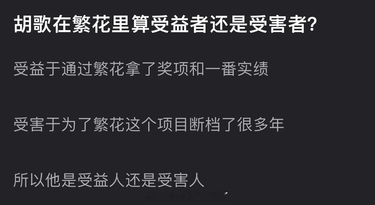 大家感觉胡歌在繁花里算受益者还是受害者?受益于通过繁花拿了奖项和一番实绩,受害于