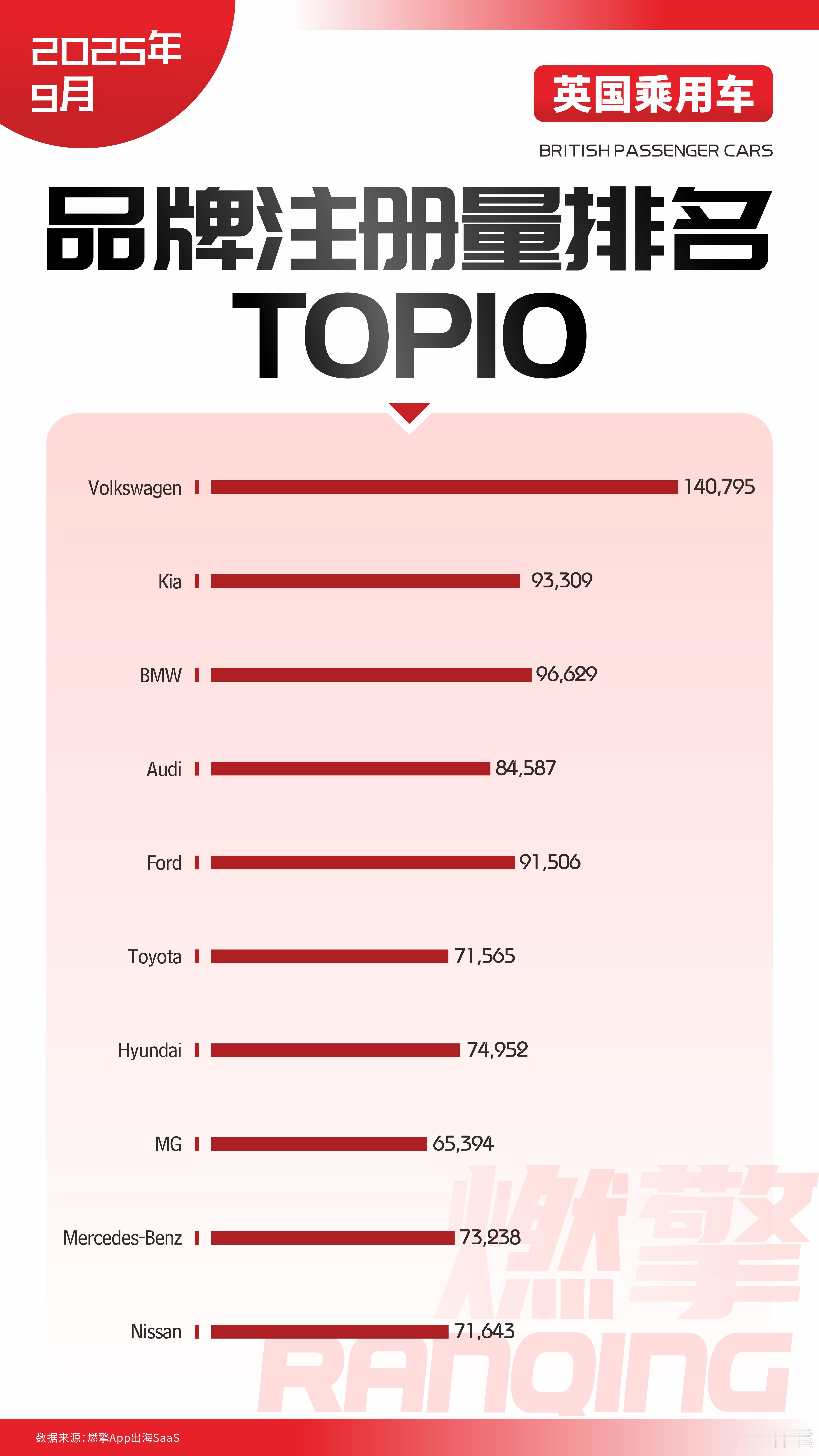 大众以140795辆注册量遥遥领先,凭借全品类产品矩阵(燃油车+新能源ID系列)、深厚品牌认知及本地化运营,在英国市场构建起难以撼动的规模壁垒,成为覆盖“经济型到中高端”需求的核心品牌。