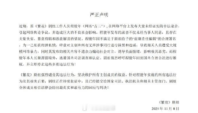 繁花剧组发布声明坚决维护所有主创成员的权益,对古二进行取证。目前爆出来的录音需要保护的主创主要是王家卫、秦雯。建议正面回应,到底哪些是失实的,哪些是恶意剪辑和恶意解读的?尤其事关一些敏感话题的。