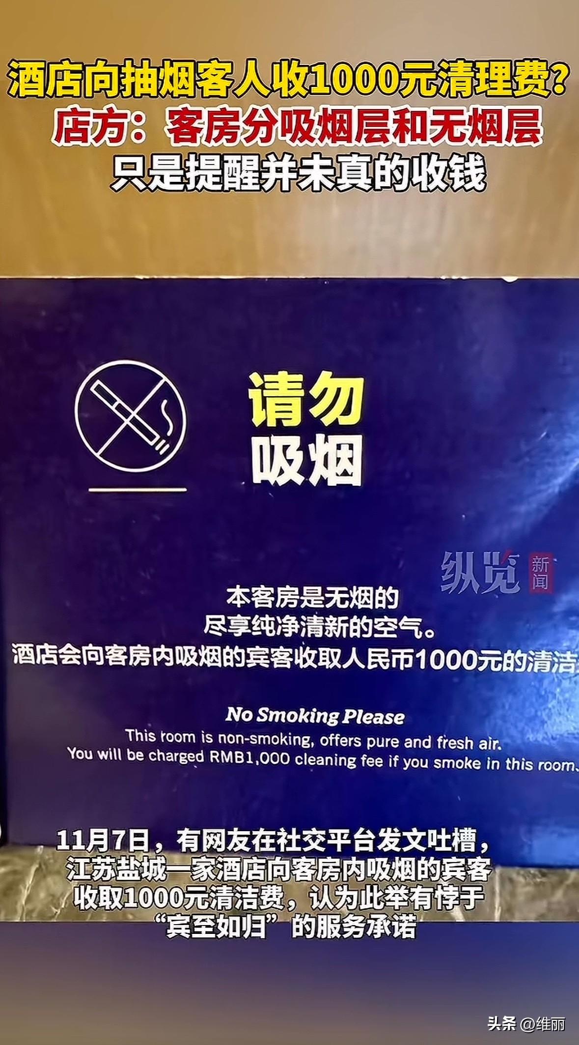 江苏盐城一家酒店最近引发热议,无烟客房提示牌写着吸烟收1000元清洁费,网友质疑定价是否合规、不够贴心。酒店回应称有吸烟层可换房,这提示只是警示,开业至今从没真收过,发现吸烟只重做无烟处理。 其实室内公共场所禁烟是有规定的,酒店设无烟房合情合理。有人觉得1000元太高像吓唬人,也有人觉得该约束不遵守规则的客人。个人觉得,提示明确是好事,但收费标准若能更透明会更稳妥。客人住店该守规矩,酒店也得平衡好管理和服务,这样双方都舒心,你怎么看这事?
