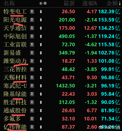 比如,大家的信仰还在小登科技,但市场赚钱效应早就转移到中登了。新能源+电力慢慢走上了舞台中央,今天成交靠前的15家公司里,有10家是新能源行业的!