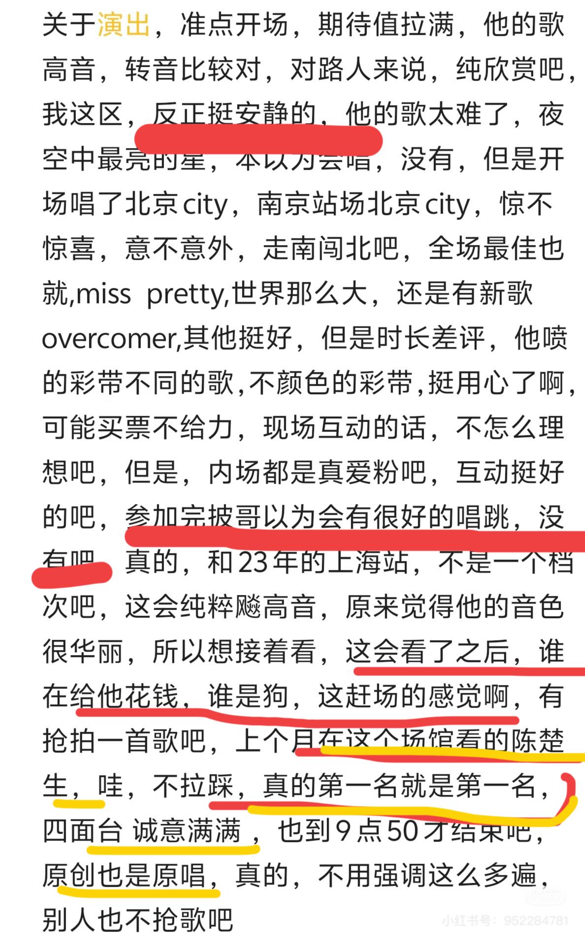 关于苏醒南京演唱会竟然看到了差评!与楚生的有差距。 一是时长,总共才2小时,而且中间还有放短片和talking。网友吐槽这是他看的时长最短的一场。 二是买票,没想到提早买的不如临场买的便宜,因为打折了。 三是除了内场互动较多,外围相对是路人观众,因为歌比较生疏而很安静。 四是参加完披哥后竟然在演唱会上没有唱跳舞台。 总之,该网友对比了同一场地的陈楚生的演唱会,冠亚的差距太明显,重点是生哥很有诚意,不仅是舞台设施,还是歌曲,以及演唱会设计等,楚生真的很用心。