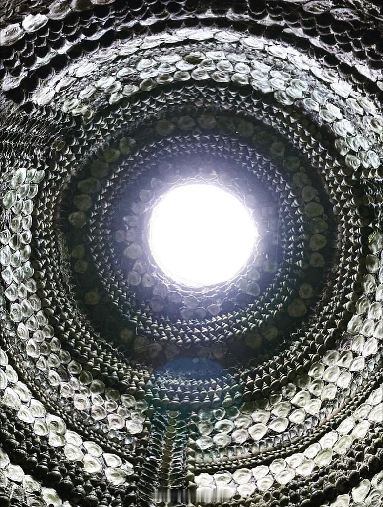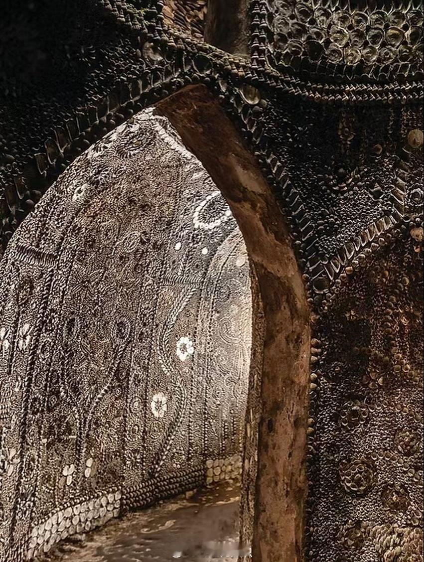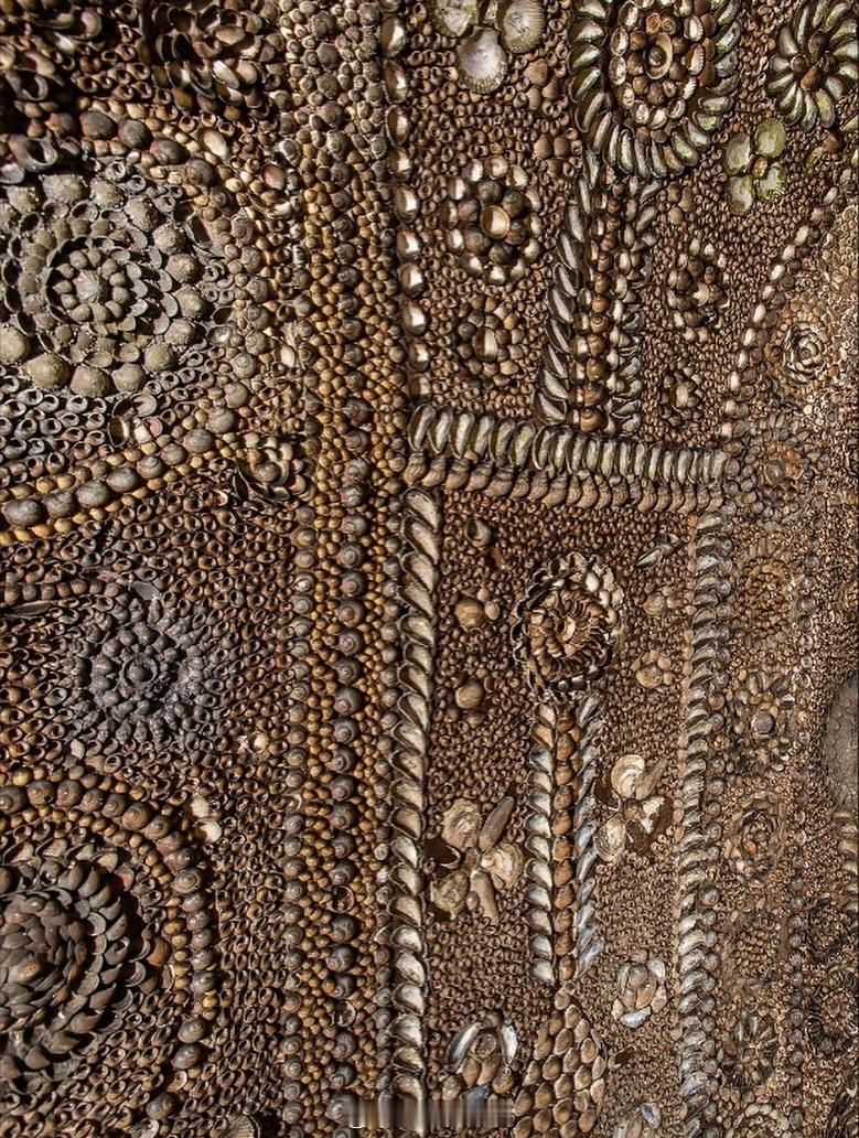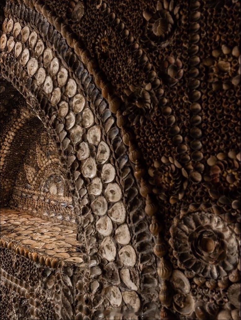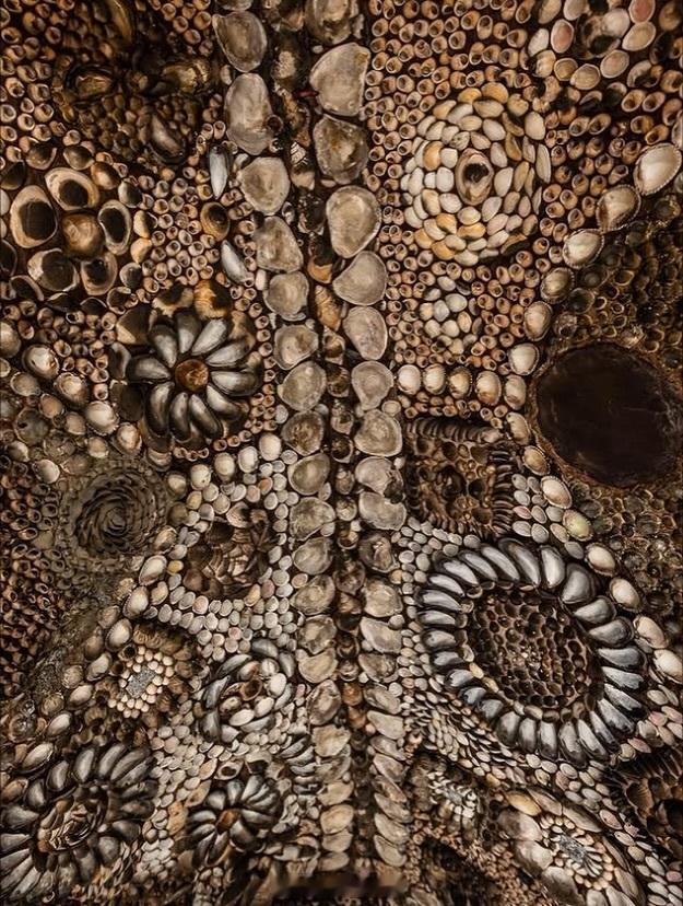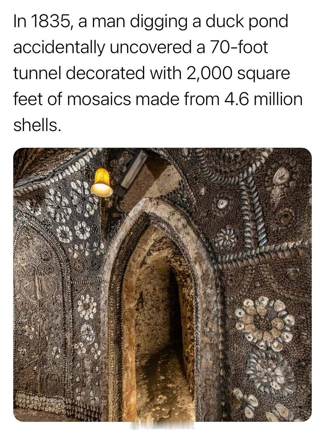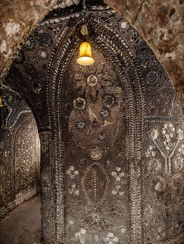 1835年,英国马盖特的一名男子在挖鸭子池塘时发现了一个隐藏的地下通道。 里面是贝壳石窟,一个70英尺长的隧道,排列着超过460万个贝壳,排列着复杂的图案和符号。 占地约2000平方英尺,马赛克闪烁着光和神秘的光芒。