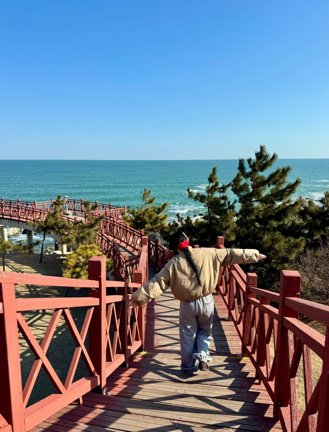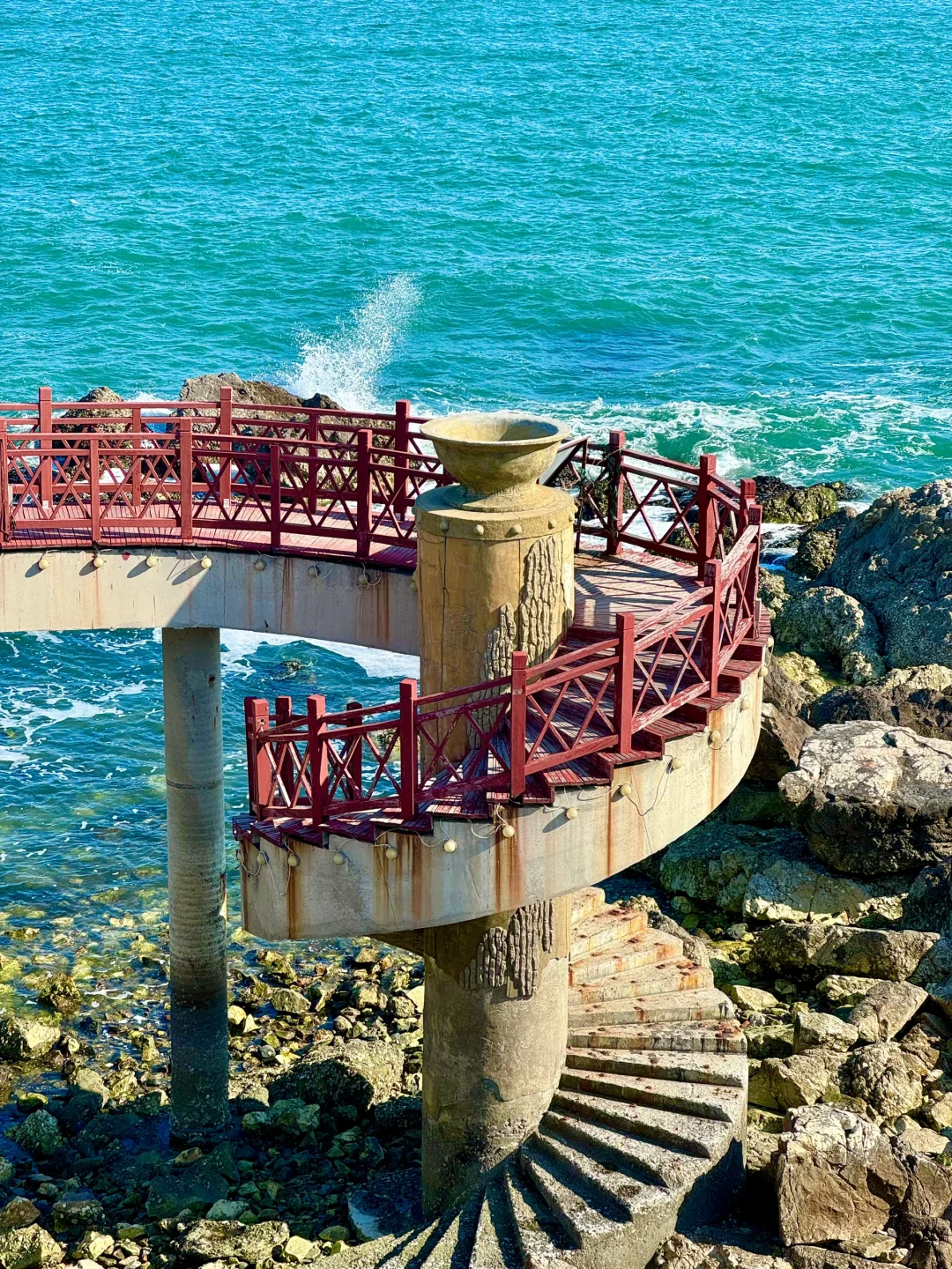 打卡红色海上木栈道 还有复古旋转阶梯 视野开阔