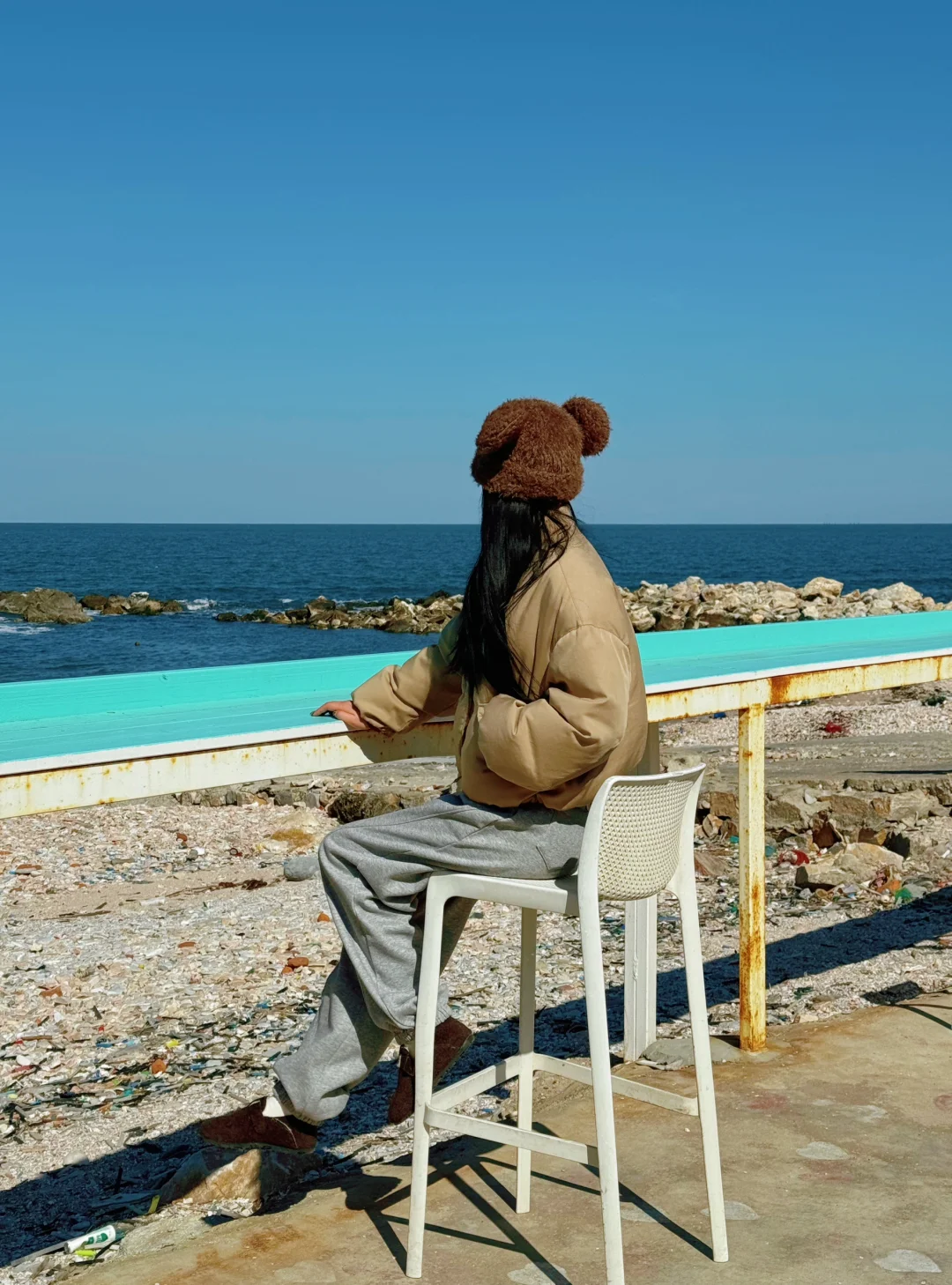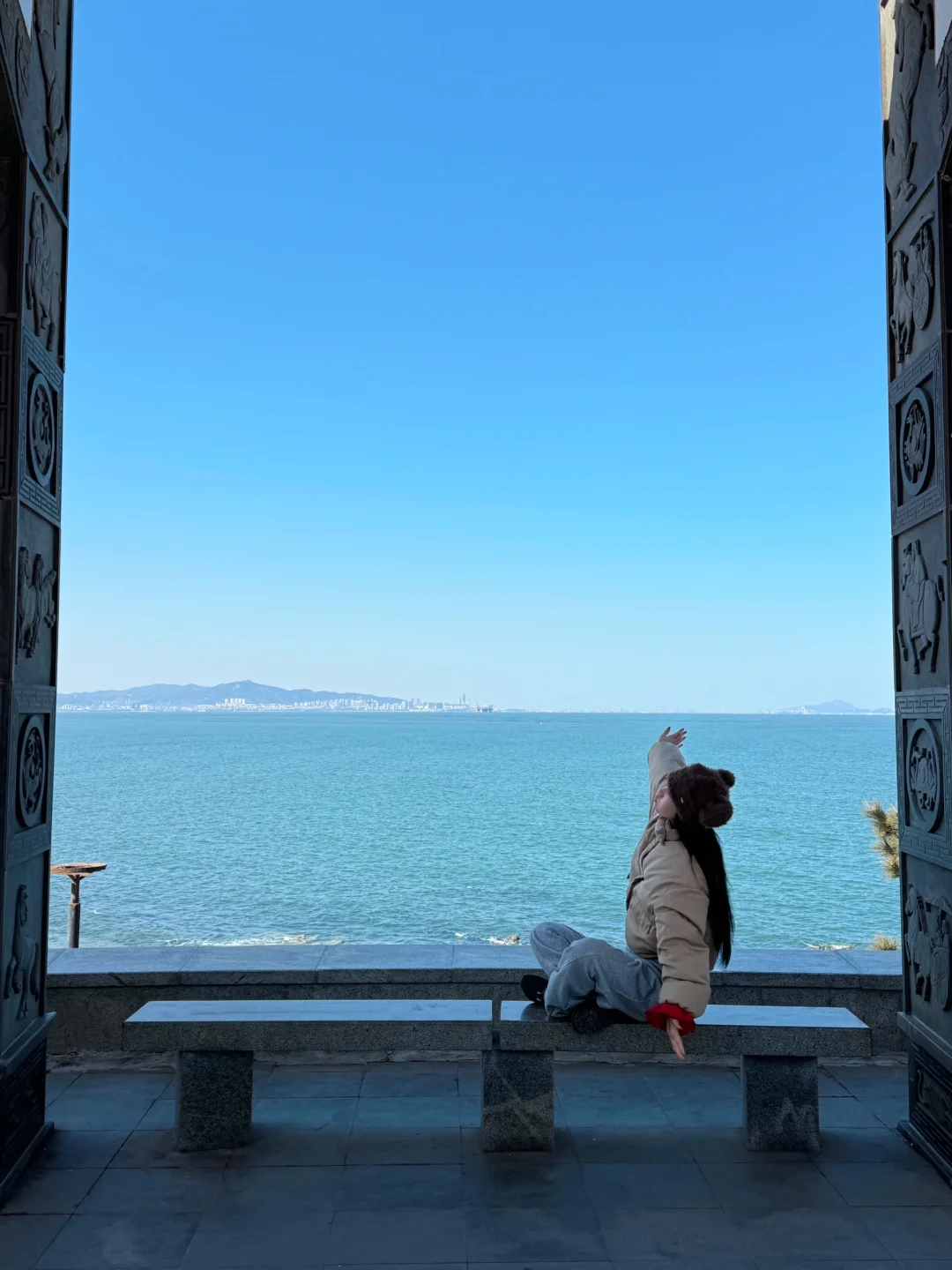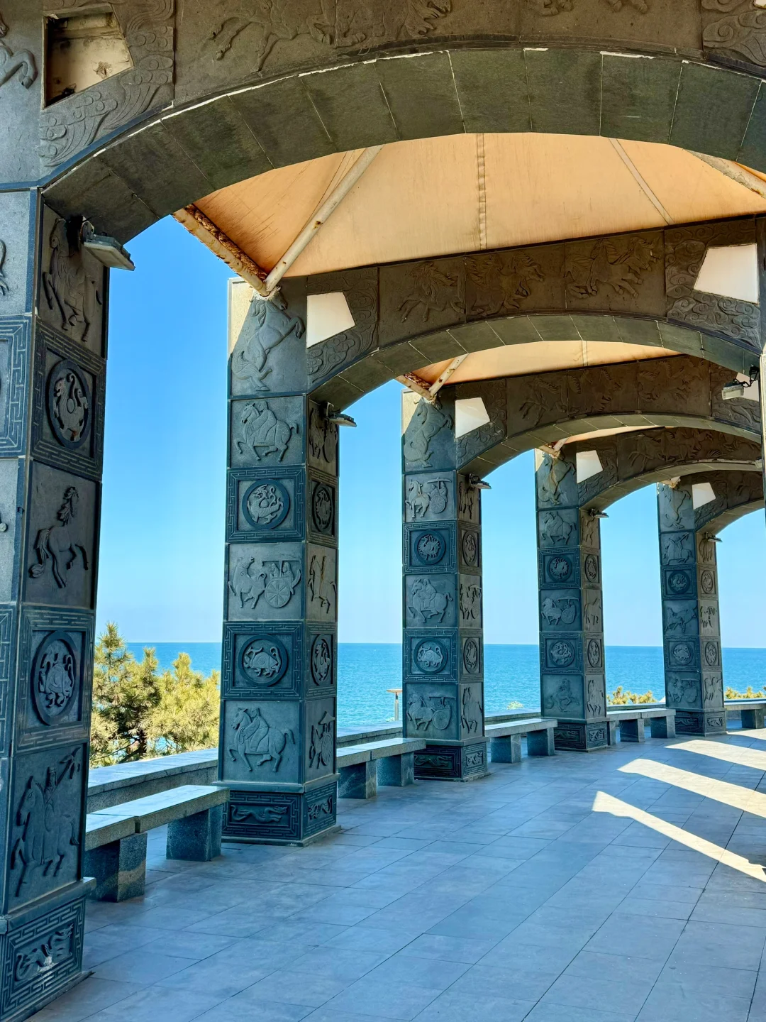 坐在石凳上拍大海相框🖼️和复古的长廊