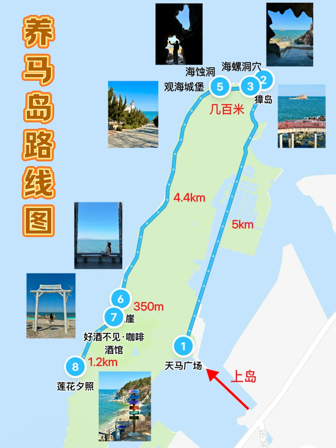 天马广场(入口)➠獐岛➠海螺洞穴➠海蚀洞➠观海城堡➠秦风崖➠好酒不见·咖啡酒馆➠海岛日记➠莲花夕照