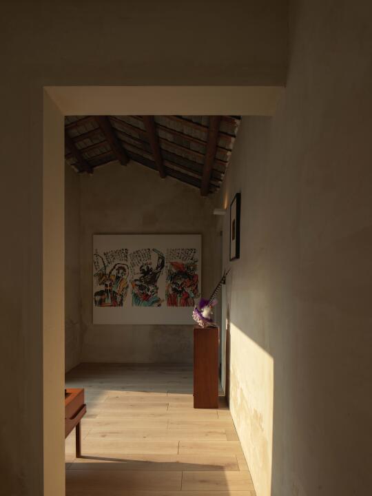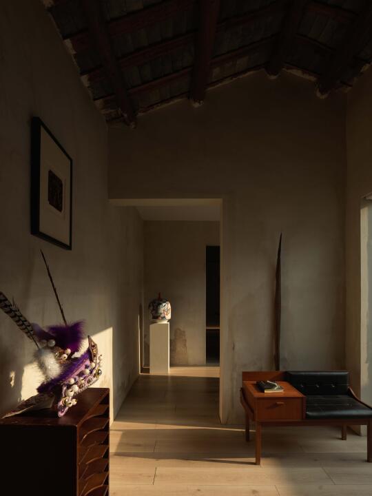 传统老墙与当代家具、艺术品之间的反差制造出极强的画面张力,无论是自然光洒落在木地板上的一瞬,还是红色体块与藤椅交错的构图,都很是出片了 📸
