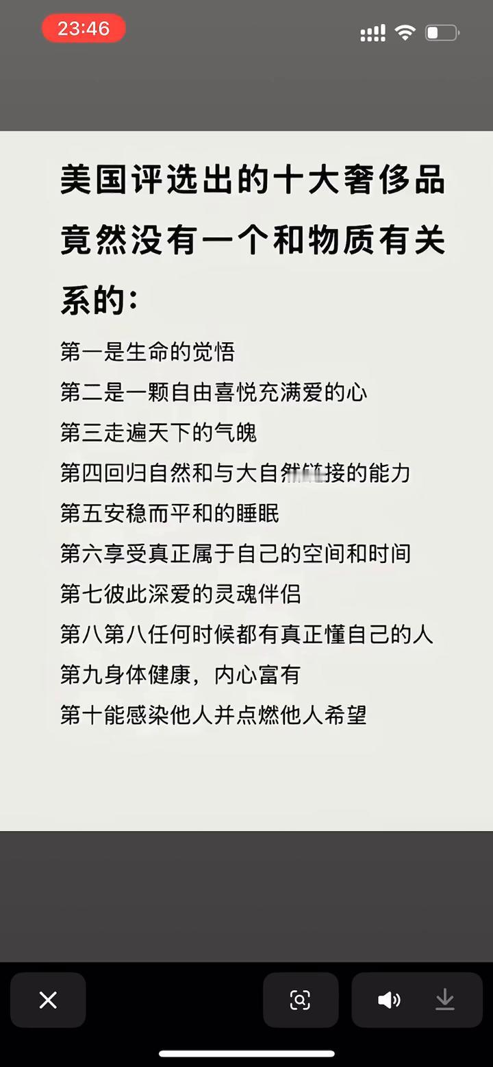 美国评选出的十大奢侈品竟然没有一个和物质有关系的。 ·第一是生命的觉悟。 ·第二是一颗自由喜悦充满爱的心。 ·第三走遍天下的气魄。 ·第四回归自然和与大自然链接的能力。 ·第五安稳而平和的睡眠。 ·第六享受真正属于自己的空间和时间。 ·第七彼此深爱的灵魂伴侣。 ·第八任何时候都有真正懂自己的人。 ·第九身体健康,内心富有。 ·第十能感染他人并点燃他人希望。