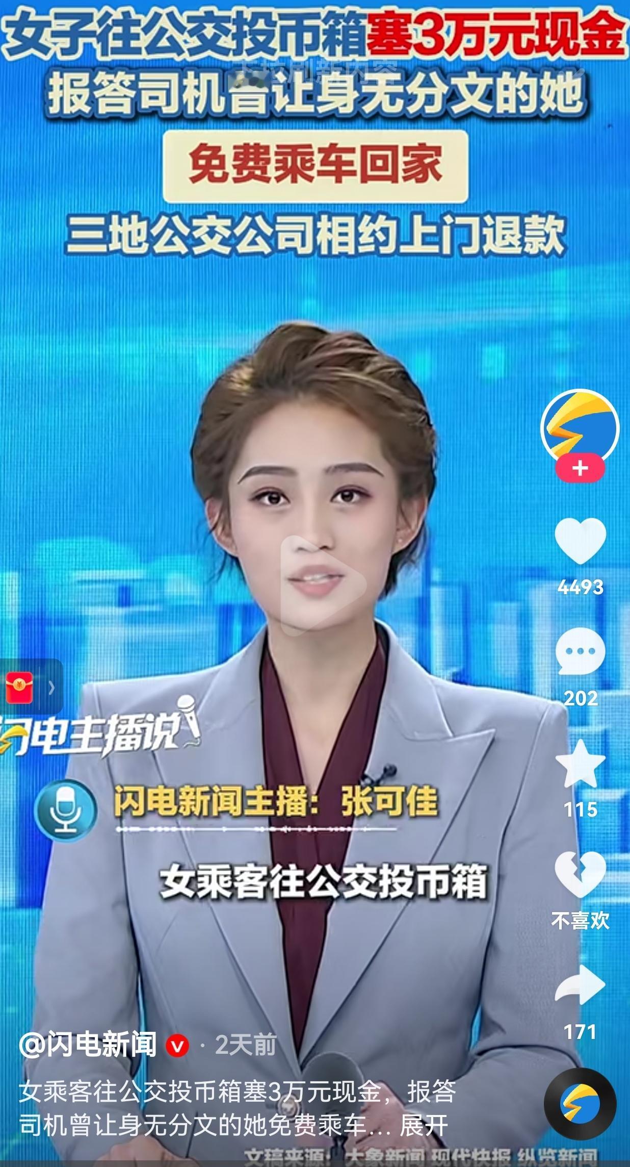 好人有好报!一女子往公交车投币箱塞了3万元的现金,只为报答司机曾经让身无分文的自己免费乘车回家。网友:真的是滴水之恩当涌泉报! 10月30日,常州68路公交车上来了一位女乘客,她先是刷卡,而后直接往投币箱投了1万元的现金。 这一幕被公交车司机看到了,赶紧上前阻拦,可是,这位女乘客不顾劝说,最终,还是把一万元现金塞到了投币箱中。 事后,常州公交司机发动网友的力量,全网寻找这位女乘客,希望将这笔巨款退还。 在寻人的过程中,常州公车得知了这位女乘客不仅在自己这里投了巨款,还在无锡、宜兴的公交车上都投了万元巨款。他们也在寻找这位女乘客。 后来,经过一番寻找,终于找到了这位女乘客廖阿姨。 并询问了原因,问廖阿姨为什么要这么做呢? 原来是因为曾经她身无分文,三地公交车免费把她送回了家,这样做也只是为了报恩而已。 现在,三地公交车相约要一起上门还款。 网友看到后评论说,曾经的举手之劳,根本没有想过要什么回报。没想到的是,廖阿姨却铭记于心一直没有忘记,并在自己有能力的时候,送来巨款。 还有的网友说,受人滴水之恩当涌泉相报,大姐是一个懂得感恩的人! 小小的善举,很多人都没有放在心里,或许早已经忘却。然而,接受恩惠的廖阿姨却认为这件事情很重要。如果当时没有三地公交的帮助,自己可能回不到家。 所以,廖阿姨一直将这件事情放在心里,怀着感恩之心,总希望自己有能力的时候,报答一下他们的善意。因此,她才会做出如此举动。 针对此事,大家有什么看法呢?欢迎大家评论区讨论留言。