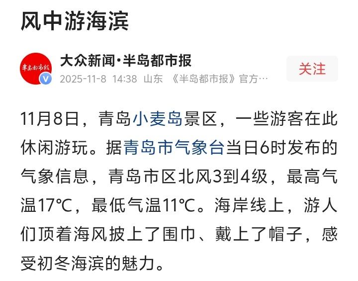 青岛小麦岛惊现治愈系风景线!游客顶17℃海风漫步海岸线,摄影师拍下震撼画面 初冬的青岛小麦岛,此刻正展现出它最动人的模样。清晨的阳光洒在波光粼粼的海面上,三三两两的游客沿着海岸线漫步,他们裹着五彩斑斓的围巾,戴着各式各样的帽子,在海风中谈笑风生。这番景象宛如电影画面,让人瞬间忘却了都市的喧嚣。 据青岛市气象台发布的信息,当日市区北风3到4级,最高气温17℃。虽然带着些许凉意,但这份清爽反而让小麦岛更添魅力。海风轻抚着游人的发丝,海浪有节奏地拍打着礁石,共同奏响了一曲冬日的交响乐。 一位来自北京的游客兴奋地表示,这是她第一次在初冬时节来到青岛。原本担心天气太冷,没想到17℃的气温配上清新的海风,反而让人神清气爽。她特意系上了准备好的羊毛围巾,在海边拍下了无数美照。 在社交媒体上,小麦岛的美景正在引发热议。许多网友晒出自己拍摄的照片:有情侣依偎在礁石上看海的温馨画面,有朋友相聚野餐的欢乐场景,还有独自一人静坐思考的静谧时刻。每一张照片都在诉说着属于这个季节的独特故事。 当地导游介绍说,每年这个时候都是小麦岛的淡季,但恰恰是这个季节最能展现它原始的美。没有了夏季的拥挤人潮,游客可以更自在地欣赏海景,感受大自然的馈赠。这里成为了摄影爱好者的天堂。 环境保护专家提醒游客,在享受美景的同时也要爱护这片珍贵的海岸线。随着游客增多,希望大家都能自觉带走垃圾,不破坏礁石生态,让更多人能够持续享受这份美好。 旅游业内人士分析,像小麦岛这样的景区正在成为都市人短暂逃离压力的首选。在初冬的暖阳下,吹着海风散步,不仅能锻炼身体,更能洗涤心灵。这种轻松惬意的旅行方式越来越受到年轻人青睐。 望着远处海天一线的壮丽景色,听着海浪与风声的合鸣,让人不禁感叹大自然的鬼斧神工。这个初冬,不妨也来小麦岛走一走,让海风带走烦恼,让美景治愈心灵。 (来源:半岛都市报、青岛市气象台、青岛市旅游局) 青岛身边事 青岛生活