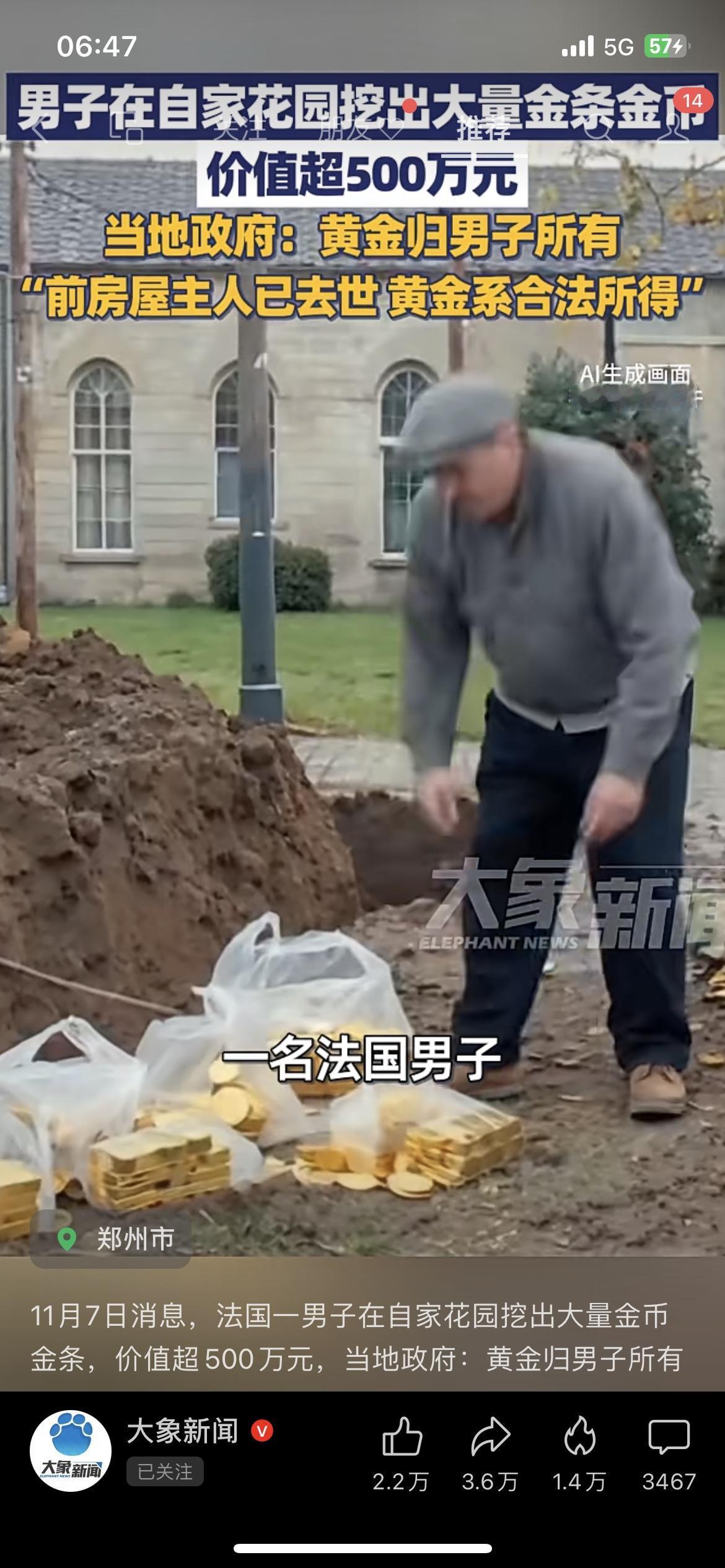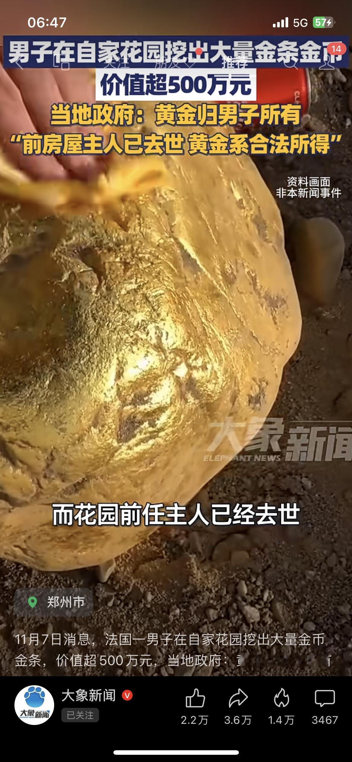 法国男子花园挖500万黄金 谁懂啊!法国一老哥在家刨花园种点菜,一铲子下去挖出一堆金条——价值直接干到500万人民币! 更离谱的是政府:‘这黄金归你了’。因为前房主早没了,也没继承人,挖着就算你的合法所得。 现在满脑子都是:我家阳台花盆底下,是不是也埋了点啥?男子花园挖500万黄金 你家院子今晚刨不刨?”