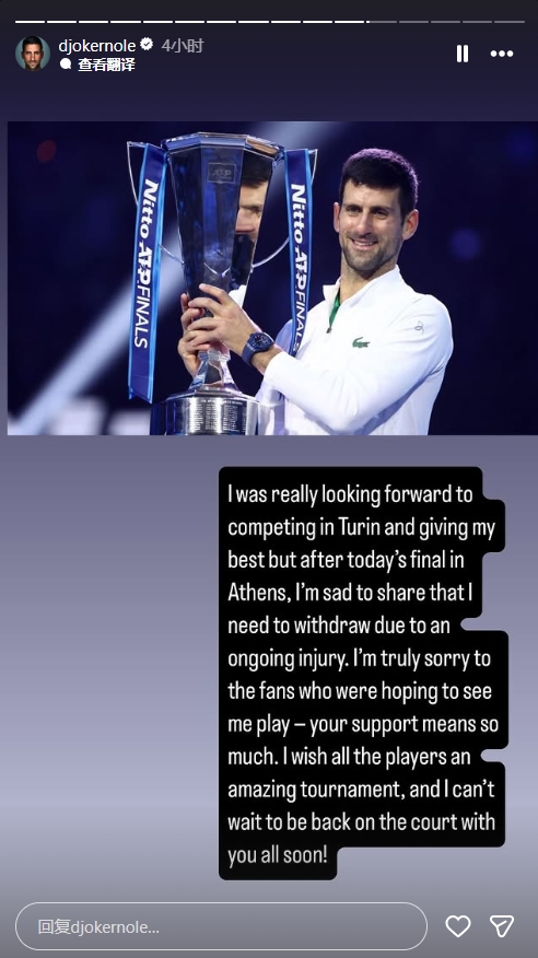 德约科维奇在声明中说到:“我原本非常期待在都灵参赛并尽我所能,但今天在雅典的决赛之后,我很遗憾地宣布,由于伤病我不得不退出比赛。对于希望看到我参赛的球迷们,我深感抱歉,你们的支持对我来说意义重大。祝愿所有参赛球员都能取得好成绩,我迫不及待地想尽快回到赛场与大家重聚!”