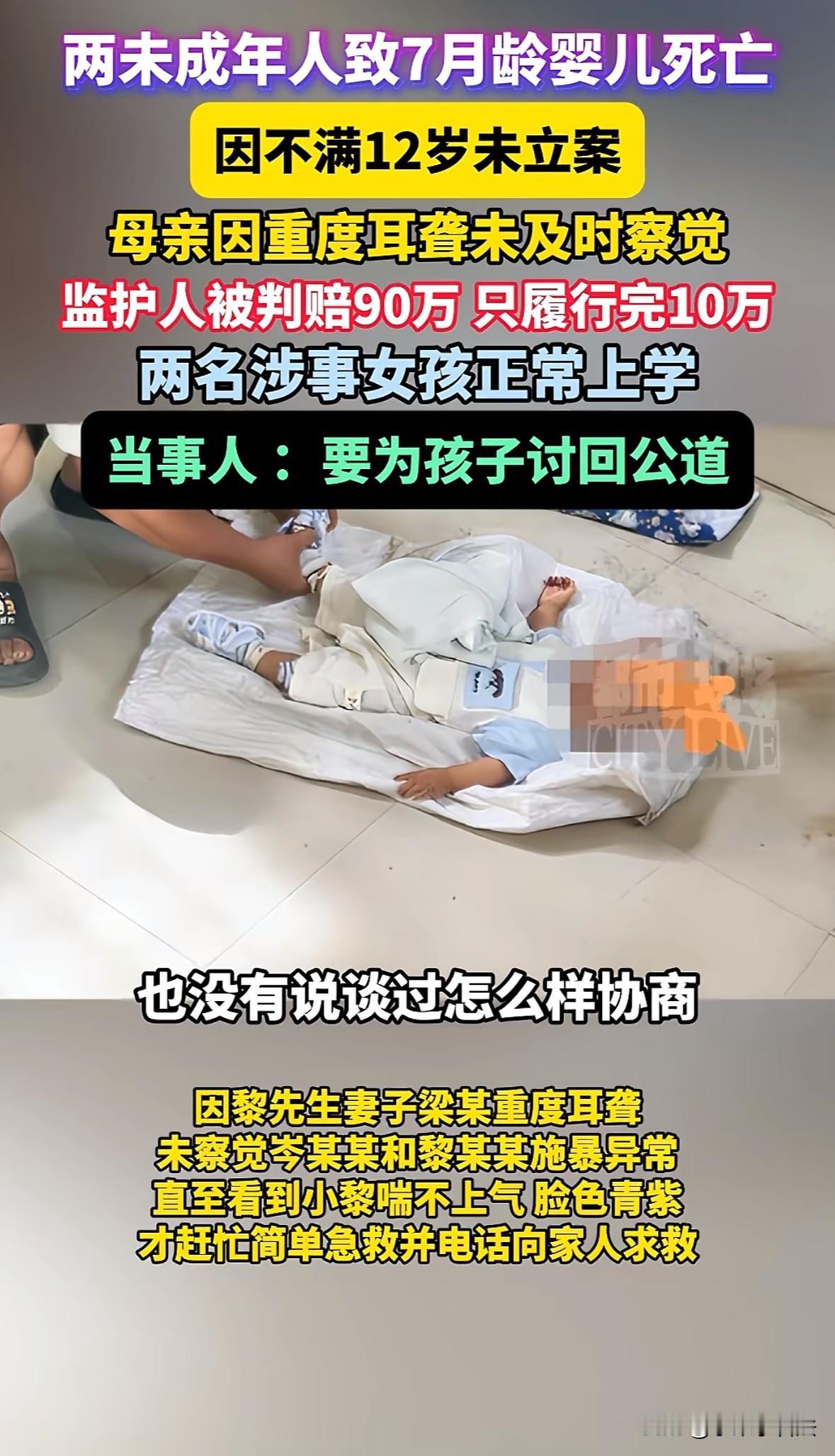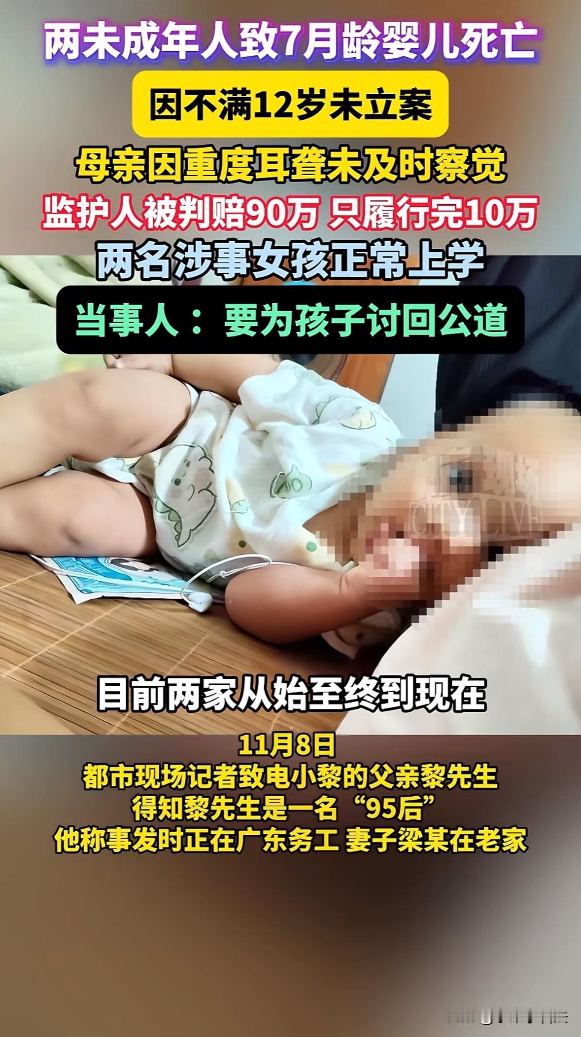 广西百色,7个月大的婴孩被邻居2个不满12周岁的女孩从高处摔到地上,然后又用力踩踏,在婴孩大哭不止后,将婴孩归还给其父母。父母发现婴孩不行后,送医抢救无效死亡。因2个女孩不满12周岁,未达到追究刑事责任年龄不予立案。婴孩父母将2个女孩以及监护人告上法庭要求民事赔偿,法院判决赔偿90余万元,但双方家庭一句没钱,赔偿款迟迟不到位,婴孩家人患上重度抑郁症。 黎先生的家庭在2024年7月21日发生巨变,年仅7个月大的儿子被2个不满12周岁的邻居女孩殴打致死,因2个女孩未达到追究刑事责任年龄,公安部门不予立案。 黎先生7个月大的儿子是2024年1月1日出生,儿子出生后,邻居家的2个留守女孩黎某盼和岑某某就经常会来黎先生家玩耍。 一直以来2个女孩到黎先生家都没有异常,直到2024年7月21日,2个女孩的行为导致黎先生7个月的儿子意外身亡。 当天下午5点,2个女孩黎先生家玩耍,但是十多分钟后就将黎先生大哭不止的儿子交给黎先生的爱人后便离开。 黎先生的爱人接过孩子后就一直在哄孩子,但是怎样都哄不好,就发现孩子出现呼吸困难的情况,孩子可能要不行了,于是赶紧将孩子送往医院救治,但经抢救无效死亡。 黎先生在悲痛之余调取出儿子出事前的监控录像,发现2个女孩曾将婴孩从卧室抱到客厅和家门口,对婴孩有过打掐的行为,将婴孩弄哭。 黎先生赶紧报警,警方给出鉴定意见告知书,7个月大的儿子符合胸部受钝性外力作用造成心脏破裂导致心脏压塞死亡。 经过警方的调查,外力作用是由于2个女孩将7个月大的婴孩摔在地上,再用力踩踏造成的。 根据《刑法》第17条的规定:已满十二周岁不满十四周岁的人,犯故意杀人、故意伤害罪,致人死亡或者以特别残忍手段致人重伤造成严重残疾,情节恶劣,经最高人民检察院核准追诉的,应当负刑事责任。 因不满十六周岁不予刑事处罚的,责令其父母或者其他监护人加以管教;在必要的时候,依法进行专门矫治教育。 因2个女孩都未满12周岁,未达到追究刑事责任年龄,因此公安部门不予立案。 黎先生表示,未满12周岁就像一张免死金牌,拿她们一点办法都没有。 无法追究刑事责任,黎先生只能追求2个女孩的民事赔偿责任,于是将2个女孩以及监护人一起告上法庭。 根据《民法典》第1165条的规定:行为人因过错侵害他人民事权益造成损害的,应当承担侵权责任。 依照法律规定推定行为人有过错,其不能证明自己没有过错的,应当承担侵权责任。 2个女孩对7个月大的婴孩打掐,将婴孩从高处摔在地上,并进行用力踩踏,导致其死亡的行为,应该承担侵权责任。 根据《民法典》第1188条的规定:无民事行为能力人、限制民事行为能力人造成他人损害的,由监护人承担侵权责任。监护人尽到监护职责的,可以减轻其侵权责任。 有财产的无民事行为能力人、限制民事行为能力人造成他人损害的,从本人财产中支付赔偿费用;不足部分,由监护人赔偿。 因为2个女孩都属于未成年,因此其应该负担的侵权责任应该由其监护人承担连带侵权责任。 女孩岑某某和监护人辩称,黎先生才是应该承担事故的主要责任。是黎先生委托给2个女孩照顾自己的儿子的,而且黎先生听到孩子哭闹却没有出门查看,有一定的责任。 岑某某和监护人还表示,黎某盼有偶尔打小孩的不良习惯,黎某盼和岑某某是对孩子的哭闹声烦躁才对其实施了加害行为。 黎先生大意疏忽,没有注意到2个女孩的行为,应该承担90%的责任。 女孩黎某盼和监护人辩称,黎某盼的行为是受教唆而实施的,不应该承担侵权责任。 7个月大的婴孩死亡结果与黎某盼的行为因果关系到底是否成立,黎先生应该进行举证,若是举证不成,应该承担举证不成的不利后果。 黎某盼和监护人表示,婴孩死亡的原因主要是岑某某的暴力踩踏,以及黎先生和家人错误急救导致,黎某盼承担的赔偿责任应该小于10%。 法院审理后认为: 岑某某和黎某盼共同实施对7个月大的婴孩从高处抱摔,踩踏的行为,是导致婴孩死亡的原因,两个人平均承担责任。 黎先生的家人患有神经性耳聋,虽然听到孩子的哭声较大,但是没有外出查看。 根据《民法典》第1179条的规定:侵害他人造成人身损害的,应当赔偿医疗费、护理费、交通费、营养费、住院伙食补助费等为治疗和康复支出的合理费用,以及因误工减少的收入。造成残疾的,还应当赔偿辅助器具费和残疾赔偿金;造成死亡的,还应当赔偿丧葬费 和死亡赔偿金。 法院最终判决,由岑某某和黎某盼的监护人共同承担黎先生的损失90.5977万元。 事后2个女孩家各自给了5万丧葬费,司法救助又给了3万元后,虽然法院判决赔偿90万,但是2个女孩家一句没钱,就没有了下文。