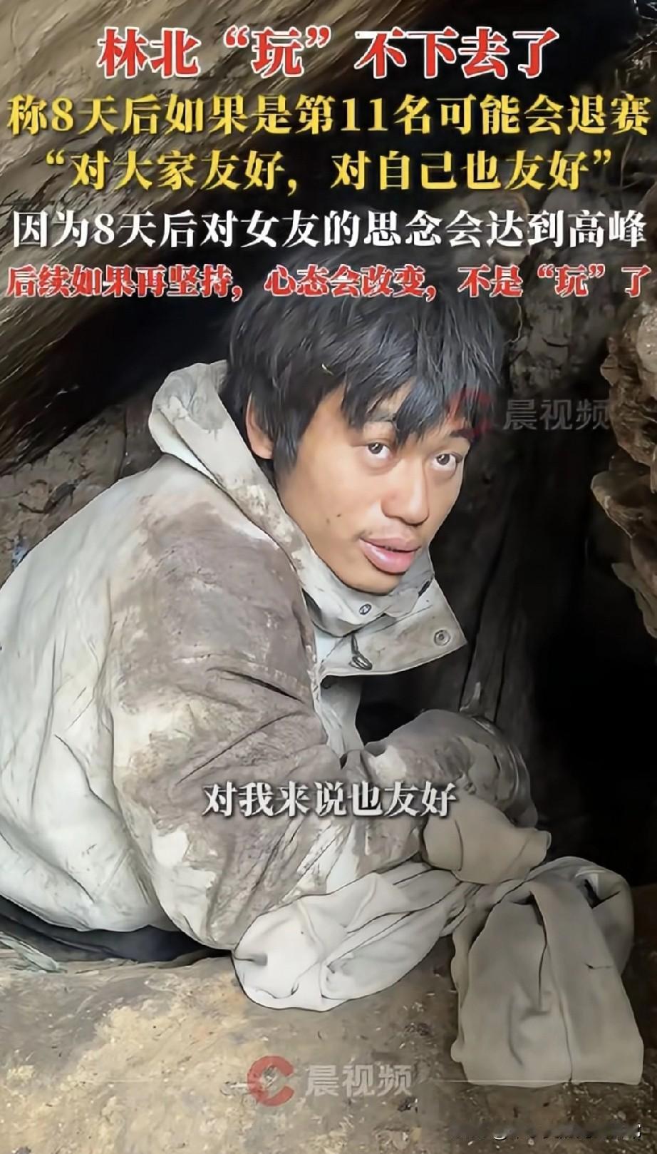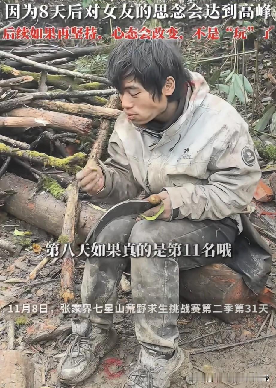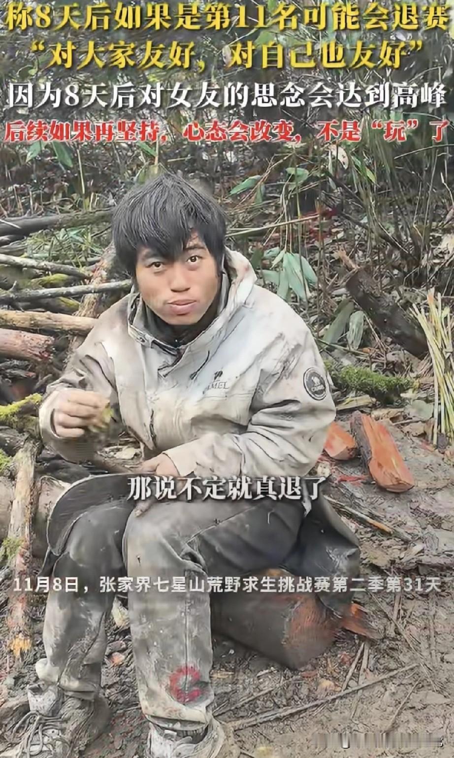荒野求生林北放话,8天后想女友到顶峰,第11名就退赛! 张家界荒野赛的林北彻底把我整乐了——这哥们儿裹着泥糊糊的外套,蹲在山洞里宣布:8天后要是排第11名,直接退赛! 理由居然是“想女朋友会到顶峰”,还说“硬撑着心态就变了,不是来玩的了”。这发言一出来,评论区直接炸锅:有人喊“这才是真性情!比赛哪有对象重要”,也有人怼“来参赛就该拼到底,恋爱脑误事”。 我算看明白了,这哪是荒野求生,明明是大型“恋商测试现场”。不过话说回来——要是你在这种极限比赛里,是咬着牙冲名次,还是想家想对象就撤?这到底是“活得通透”,还是对比赛不负责?