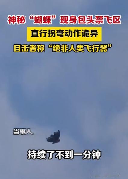 包头禁飞区惊现蝴蝶状飞行物!直行拐弯动作诡异,目击者称“绝非人类飞行器”。 风筝吧,没看他动翅膀,应该有什么东西控制他的飞行轨迹,会不会是伪装好的探测无人机。我们在深圳莲花北,每到节假日,草坪空就会出现一大批不明飞行物 前两年我见过鸟翅膀不动这样钉住在天上的然后一会自己又飞走了。当时我都懵逼了 我倒感觉像是放气球或者是底下有人放风筝,气球的模型和风筝的形状是这种蝴蝶。