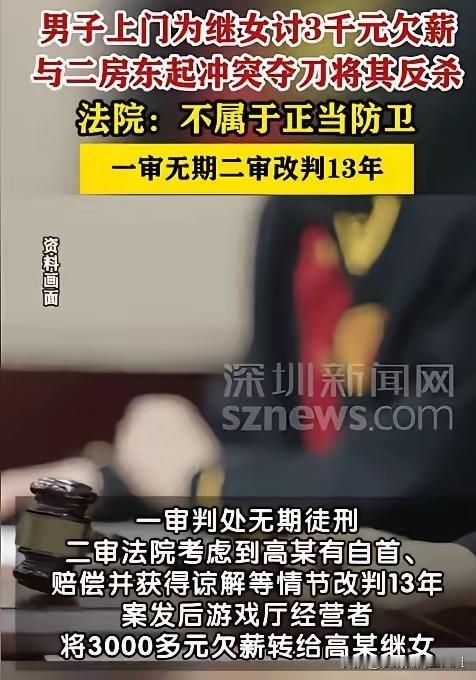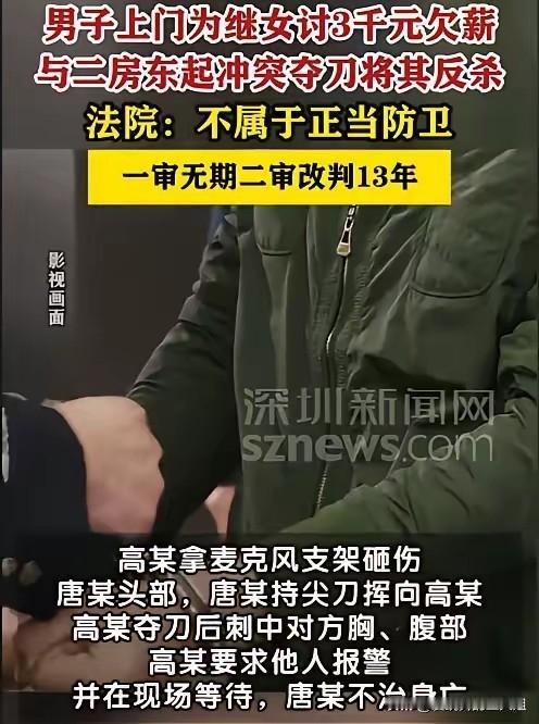 河南鹤壁,一女孩在游戏厅打工1个多月,被拖欠了3200元的工资。女孩向继父哭诉后,继父气得到游戏厅找老板讨说法,期间二人发生肢体冲突。男子先用麦克风支架砸伤了老板的头部,随后老板持刀挥刺反击,在二人争斗期间,继父抢过老板的刀捅向老板致其死亡。一审法院认定男子构成故意伤害罪,判无期。男子不服,认为自己是正当防卫为,于是提起上诉。二审判了。 河南省高级人民法院审理后作出了改判。二审法院认定高某(继父)的行为构成故意伤害罪,但同时考虑到案件是因民间矛盾引发,高某具有自首情节,要求他人报警并呼叫救护车,事后积极赔偿被害人近亲属并获得了谅解,因此将刑罚从一审的无期徒刑改为有期徒刑13年。 这事儿说起来挺复杂的。高某为继女讨薪本是占理的一方,但他在与游戏厅二房东唐某发生口角后,先动手用麦克风支架砸伤对方头部,并在唐某下楼时还喊着“你别跑”紧追不舍,这个细节对认定正当防卫非常关键。法律上的正当防卫有严格条件,它必须针对正在进行的不法侵害,而且防卫手段要合理。像高某这样先动手攻击又追击对方,整个事件就被看作是一场“互殴”的连续过程,而不是单纯的防卫行为了。 类似的情况在其他案件中也出现过。比如著名的于欢案,对方非法限制于欢母子人身自由并有侮辱行为,于欢持刀捅刺讨债人员造成一死多伤。法院认定于欢的行为具有防卫性质,但明显超过必要限度,属于防卫过当,最终从一审的无期徒刑改判为五年有期徒刑。这两个案子都说明,即使对方有过错,如果防卫手段和后果与受到侵害的严重程度相差太大,就可能要承担法律责任。 换个角度想,如果高某能通过合法途径维权,结果会大不相同。遇到工资被拖欠,劳动者完全可以先与用人单位协商,协商不成可以向劳动监察部门投诉,或申请劳动仲裁,必要时向法院起诉。法院通常判决用人单位支付拖欠的工资,有时还需支付经济补偿或赔偿金。如果高某的继女能走这些合法渠道,或许就能避免这场悲剧。 这起案件折射出底层劳动者维权渠道不够畅通的现实问题。高某选择用“私力救济”的方式讨薪,某种程度上也反映了正规维权渠道可能存在的程序复杂、耗时较长等困境。但以暴制暴从来不是解决问题的正确方式,这起案件中没有人是真正的赢家——一个生命逝去,一个家庭破碎,而高某的继女虽然最终拿到了被拖欠的3000多元工资,却付出了继父身陷囹圄的沉重代价。 法律在保护权益和维护秩序之间需要精细的平衡。一方面要保障公民的合法权益,包括获得劳动报酬的权利和受到侵害时自卫的权利;另一方面也要防止暴力升级,维护社会基本秩序。高某的案件提醒我们,维权必须在法律框架内进行,一旦逾越界限,即使初衷合理,也可能导致难以挽回的后果。 各位读者你们怎么看?欢迎在评论区讨论。