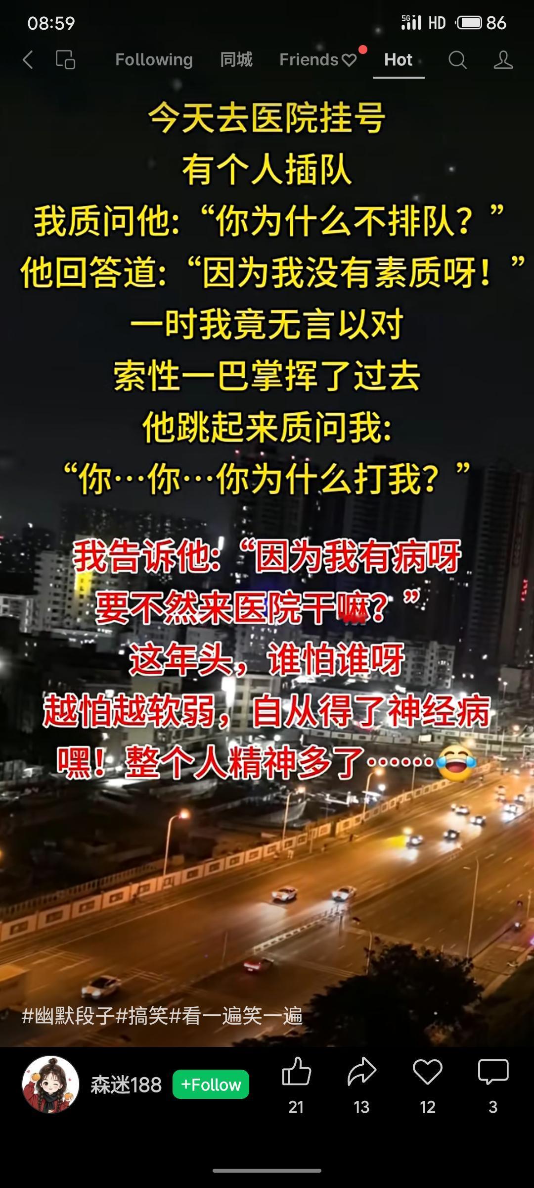 今天在医院挂号遇插队者,对方称因没素质才如此,主角打其后称因自己有病才来医院,还笑称得神经病后精神多了。