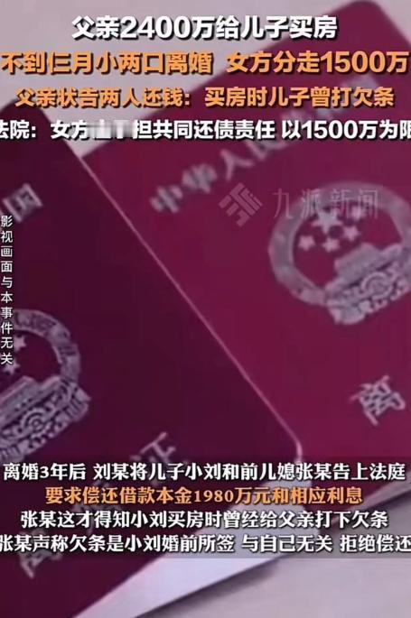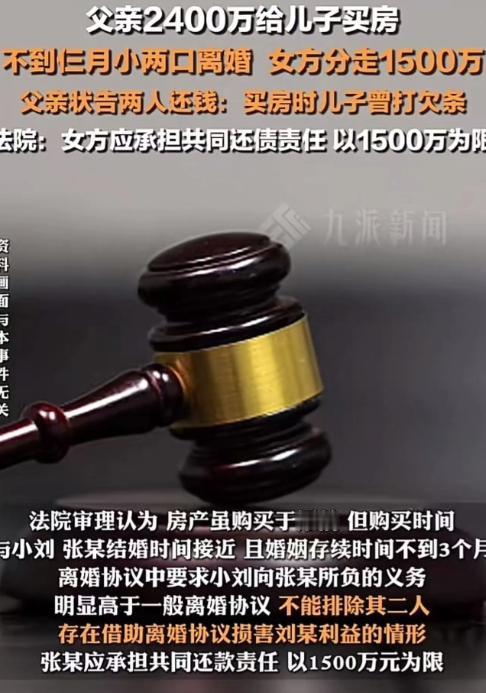 “姜还是老的辣!”4月9日报道,上海一位父亲花2400万给儿子买婚房,3个月不到小两口就离婚,女方分走1500万!但父亲技高一筹,买房时留了一手,状告两人还钱!法院:女方应承担共同还债责任,以1500万为限!   “姜还是老的辣”!   谁能想到,原本以为能分走 1500 万的女方,最后一分钱没拿到,反而要把分到的财产全拿去还债。   这事情还得从孙先生的婚姻说起,那时候孙先生和女友相处的时间1里面感情十分甜蜜挺甜,可经济条件差得有点多,女方家普通,孙先生家不一样,他爸做建筑生意,家底厚实。   随后两人在宣布要结婚的时候孙先生的父亲为了能够让儿子风风光光的举办婚礼直接就给买了一个大房子,但是他的父亲也不是吃素的,为了避免婚后会有经济矛盾。   在买房子的时候,就让孙先生给写了一个借款协议,说明房子的钱都是向父亲借的。   然而就在两人结婚之后差不多三个月的时候,女子突然提出想要与孙先生离婚,因为两人性格不合没办法继续相处下去。   这时候孙先生的父亲有点坐不住了,想着这要是离婚了之后,女子就要分一半的财产太亏了于是就在两人办完离婚手续之后,立马就将儿子以及女子告上了法庭。   随后在法庭上,法官重点看了两样东西,一是那份《借款协议》,二是银行转账记录,这时候女方辩解说这钱是婚前赠与,可律师当场指出,房款支付时间、协议内容和结婚登记时间都能对应上,明显是借款,不是赠与。   几轮审理下来,法院最终判了,这 2400 万是夫妻共同债务,女方得一起还,但最多以她分到的 1500 万为限,也就是说,女方离婚分到的钱,全得拿去还债,一分落不下。   事后这件事情被网友们刷到了之后,有人说孙先生父亲是 “法律版诸葛亮”,有远见还懂保护自己,也有人觉得这样太冷静,亲情里掺了太多算计。   此外还有人说好在父亲提前做了准备,才没让家里受大损失,要不然的话就结婚三个月就了那么多钱,简直就是“血亏”。   这事也给很多人提了个醒,感情上可以冲动,但涉及到财产,真得理性点,老一辈的谨慎,有时候还真不是多余的。   对此,你还有什么看法呢? (信息来源 :九派新闻 )
