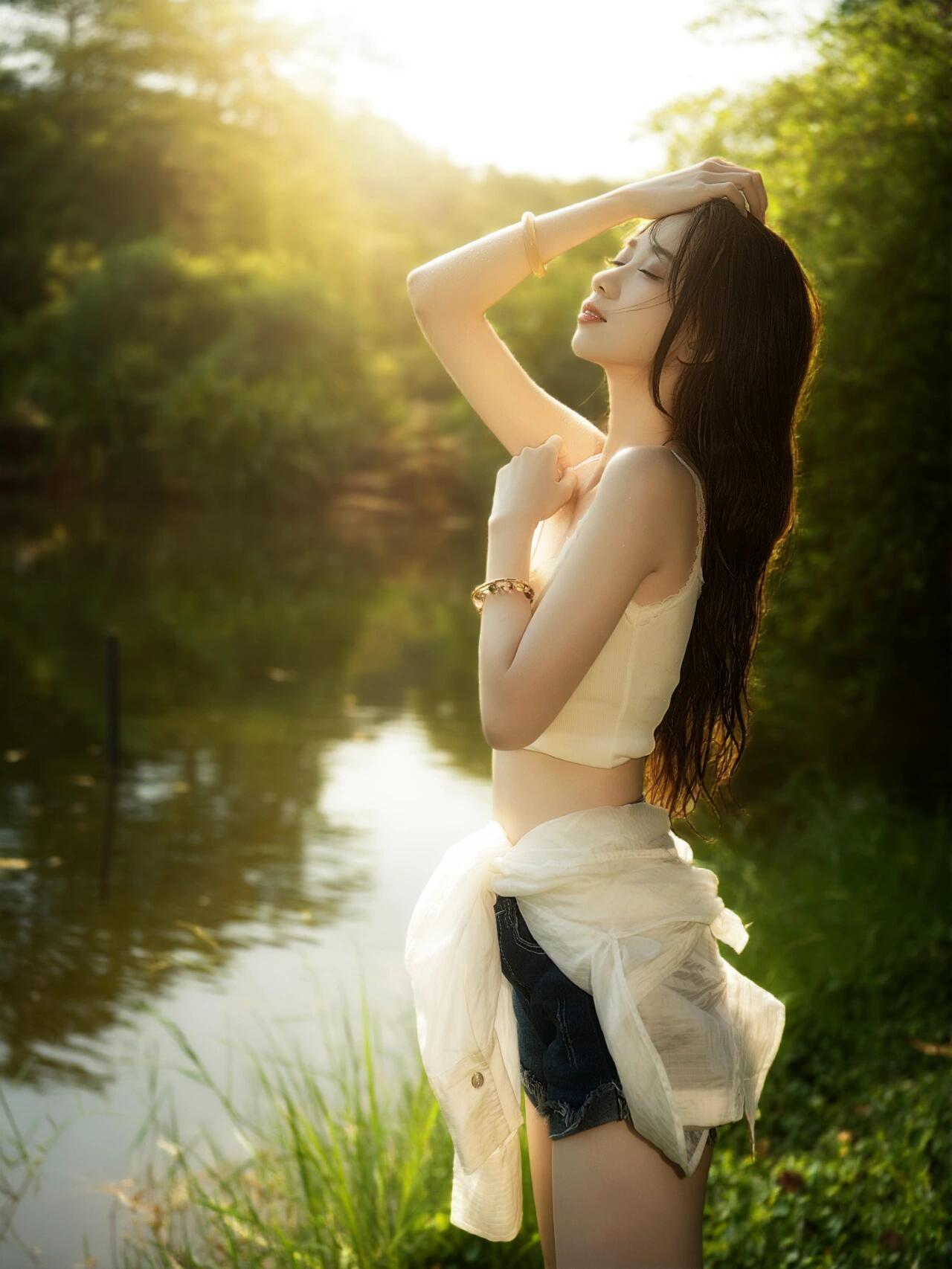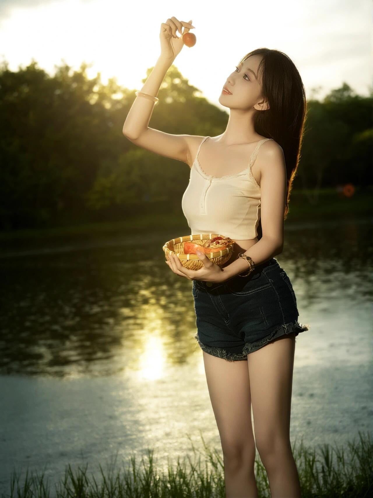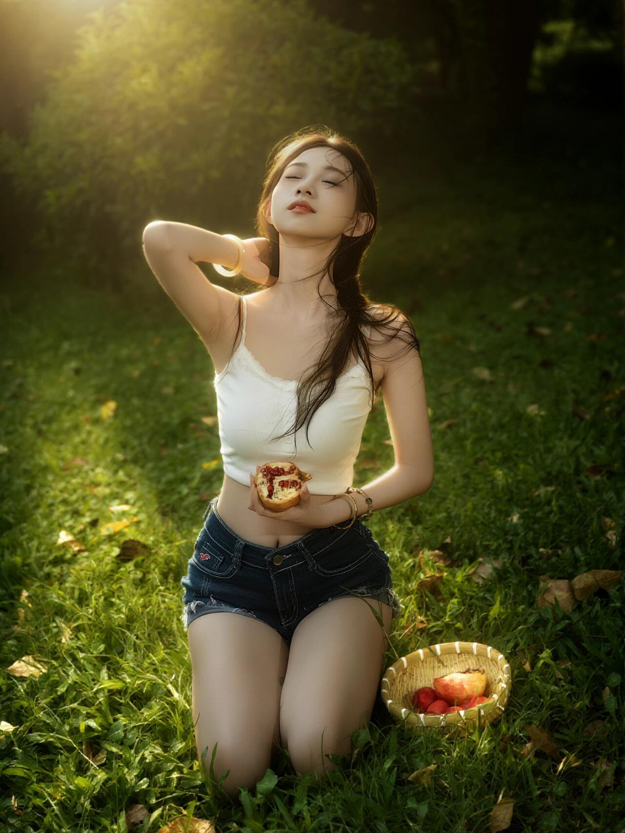 石榴在掌心裂开,红玛瑙似的籽在暮色里闪烁,像把整个盛夏的甜都封存在果壳中。湖畔的风掠过发梢,将果香揉进夕阳的金辉里。 当第一颗籽粒在齿间迸出甘冽,才懂古人为何称它“千房同膜,千子如一”——这是自然馈赠的团圆,是把山野的热烈、黄昏的温柔,都酿成一口咬下去的清甜。 在这被光影晕染的湖畔,石榴是季节写给人间的情诗,每一粒都是时光的蜜,在唇齿间漾开,把寻常的午后酿成了值得回味的梦。 = = = = = = = = = = = = = = = = = = = = 摄影技巧分享: ①拍这类「自然人像+果实」主题,可借鉴“光影+互动”双核心法:选黄昏时分的侧逆光,让光线勾勒人物轮廓与石榴的剔透感,营造朦胧氛围感; ②引导模特与石榴自然互动,或手持或轻咬,捕捉肢体的松弛感,同时利用湖畔草地的层次做前景,让画面既有故事性又具视觉纵深,轻松拍出油画般的质感。