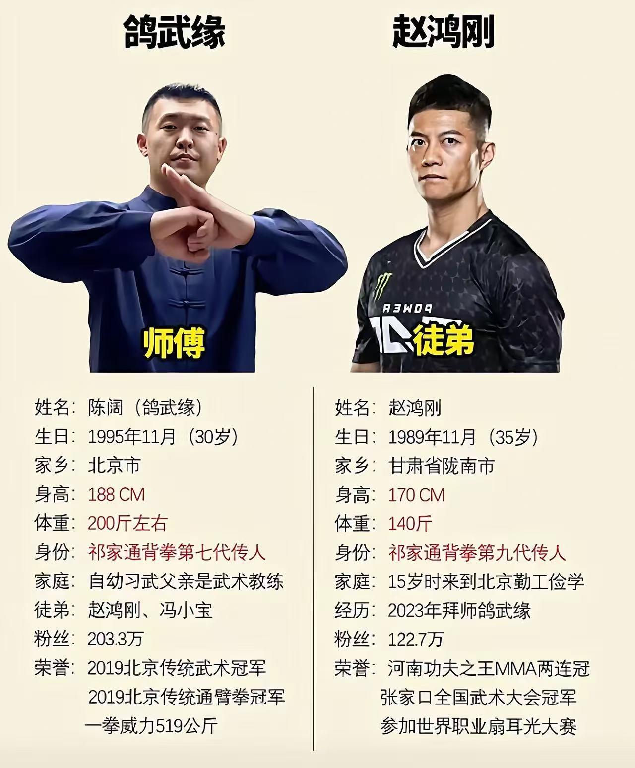 200万粉丝“武林大咖”鸽武缘为何装聋作哑?据说徒弟赵鸿刚扇耳光大赛失利回来后,师父给他炖了碗鸽子汤,却只字不提“应战”话题! 看到这个报道我都差点笑喷…… 11月1日,赵鸿刚参加“世界职业扇耳光大赛”,被哈萨克斯坦选手一巴掌扇晕,颧骨粉碎性骨折,伤势严重! 这一巴掌可不仅仅是打在赵鸿刚一人脸上,而是打在了所有中华武术人的脸上啊! 面对着哈萨克斯坦选手的步步紧逼,猖狂叫嚣“要和赵鸿刚师父一决高下”,网友们伸长了脖子等着看好戏,却发现“这里的黎明静悄悄”? 拥有234万粉丝的通背拳传人“鸽武缘”,也就是比赵鸿刚还小5岁的师父,面对老外的挑衅居然沉默不语,这就是认怂的节奏? 据说这几天吧,“鸽武缘”只做了三件事: 1、辟谣自己抖音账号修改签名是为了避风头; 2、去机场迎接弟子赵鸿刚; 3、给赵鸿刚炖了一碗滋补鸽子汤; 我去,这三件事是不是“师娘”也可以做啊,非要大名鼎鼎的师父亲自操心? 要知道,2023年,赵鸿刚拜比自己小5岁的鸽武缘为师时,可是引发了一阵轰动的,毕竟徒弟老师父小,怎么看着怎么别扭…… 今年这个所谓的扇耳光大赛,也是师父不停给弟子灌输“你是最强的”观念后,赵鸿刚信心满满的参赛而去,没想到仅仅一场比赛就被对手扇晕在地,伤势非常严重! KO赵鸿刚的阿曼塔耶夫,在赛后通过社媒持续挑衅,公开向鸽武缘下战书,并表示随时可来中国比赛,但鸽武缘未予回应! 徒弟被KO,是不是师父要站出来?有圈内人士认为,如果像这师徒俩说的那样,参加扇耳光大赛是为了弘扬中华武术精神,并宣传通背拳法,那么上场比赛的更应该是师父鸽武缘…… 可惜啊,师父如今“沉默是金”,仅仅是给徒弟炖了碗滋补鸽子汤?这叫个什么事儿? 著名的搏击高手、武僧一龙最近几天也公开表态:呼吁所有中国运动员不要参加扇耳光大赛,这是对中华武者的侮辱!因为这种比赛根本和武术无关,就是互相伤害的粗俗游戏…… 另外一名散打高手、外号“死神”的方便也以“反话正说”的口气评论:“鸽武缘不能去UFC的擂台,因为他太狠了,去的话很容易把人家打死,那一巴掌,脑浆子都呼出来了”…… 原来,鸽武缘这种只在社交媒体上以“表演”形式展示通背拳,引发过不少武林人士的讥讽,认为他根本没有什么实战能力,就是懂得网络营销,为了吸粉而已! 如今,扇耳光大赛这事闹得挺大,哈萨克斯坦选手可是一再的挑衅,指明要和“鸽武缘”切磋。 有人说,他挑衅我们就一定要应战吗?徒弟输了师父就一定要露脸,那师父岂不是忙死了…… 但是也有圈内人士认为,面对外国选手的挑衅,其他门派可以不闻不问,但是鸽武缘不行,因为这一切是你们自己惹出来的是非,你就有责任去证明和平息! 如今,恐怕是到了“通背拳传人”鸽武缘最关键的时刻了。 不应战?那么名誉受损,掉分如掉毛;应战?站着让人扇耳光的比赛规则,通背拳到底好不好使?万一输了怎么办?