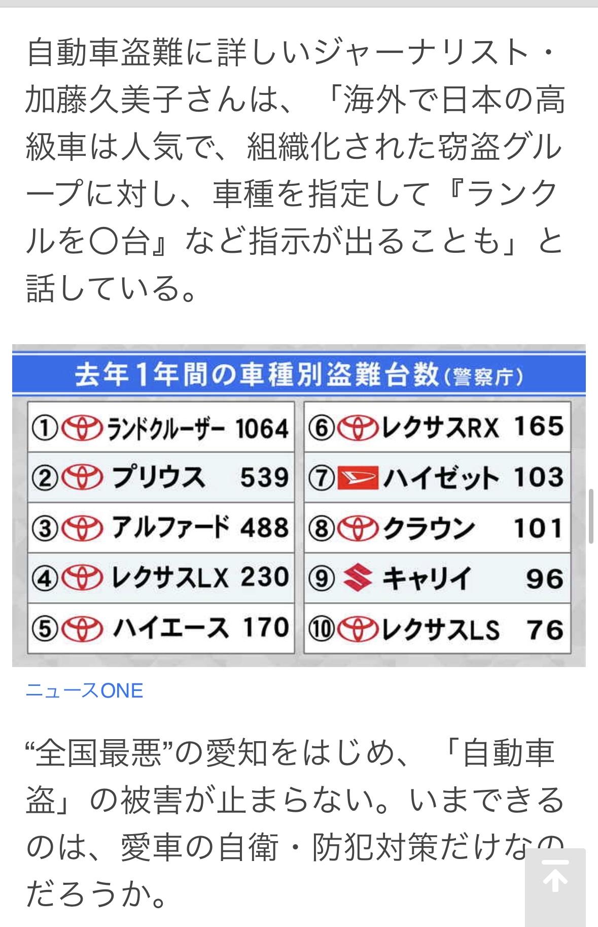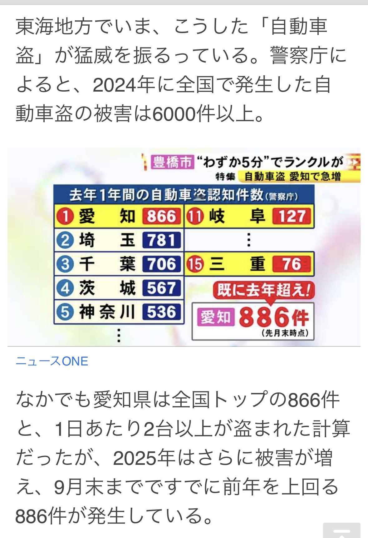 主流盗车作案手法名为CAN Invade。窃贼只需将一个手机电池大小的特殊设备连接到汽车上,并入侵汽车系统,即可在没有钥匙的情况下解锁汽车并启动发动机。 窃贼通过发送信号来打开车门锁,就像使用原装遥控器一样,这样就能在不触发汽车原有防盗警报的情况下进入车内。 汽车价格昂贵,防盗系统也不便宜,所以并非所有购车者都会安装防盗系统。犯罪分子很容易找到没有安装防盗系统的车辆,因此他们会把目标集中在这些车辆上。 日本警察厅公布了按车型划分的汽车被盗数量。去年,被盗最多的车型是陆地巡洋舰(Land Cruiser),其次是普锐斯(Prius)和埃尔法(Alphard)。 专攻汽车盗窃的记者加藤久美子解释说:日本豪华车在海外很受欢迎,有组织的盗窃团伙有时会接到特定的指令,如"陆地巡洋舰"。 汽车盗窃案数量持续上升,其中爱知县位居日本之首。 2024年盗车种类 数量 陆地巡洋舰1064台 普锐斯539台 阿尔法488台 雷克萨斯LX 230台 海狮170台 雷克萨斯RX 165台 大发海杰特103台 皇冠101台 铃木微卡96台 雷克萨斯LS 76台