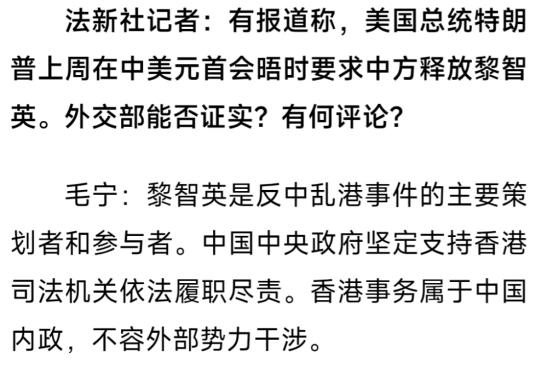在昨天(11月6日)的外交部例行记者会上,法新社记者问:“有报道称,美国总统特朗普上周在中美元首会晤时要求中方释放黎智英。外交部能否证实?有何评论?”   他可不是什么所谓的"民主斗士",而是实打实的反中乱港头目,当年香港那场乱局,他就是躲在幕后摇扇子的主谋,煽动暴力、破坏法治,把香港搅得乌烟瘴气,这些黑历史铁证如山,想洗都洗不掉。   香港的司法系统那是出了名的独立公正,法官们办案全凭证据和法律,轮得到外国政客指手画脚?黎智英案从审理到判决,每一步都严格遵循法律程序,公开透明得很,就差把庭审现场直播给全世界看了。西方媒体天天喊着"司法不公",可怎么就不提黎智英的犯罪事实确凿?怎么就不说香港法官的专业素养?   这种选择性失明,不就是典型的政治操弄嘛。咱们外交部发言人毛宁的回应那叫一个掷地有声,"坚定支持香港司法机关依法履职",这话翻译过来就是:少来这套,香港的事轮不到你美国来教我们怎么做。   说到底,香港早就回归祖国了,这块地方自古以来就是中国的领土,这一点连联合国宪章都写得明明白白。某些西方国家还抱着殖民时代的旧梦不放,总想着在香港搞点小动作,企图牵制中国的发展。   可他们也不看看现在是什么年代,中国早就不是一百多年前那个任人宰割的弱国了。黎智英之流之所以敢这么嚣张,不就是仗着有外部势力撑腰吗?可惜啊,这靠山终究靠不住,真到了关键时刻,谁会为了一个棋子跟中国彻底翻脸?   特朗普这会儿跳出来要人,说白了就是国内政治需要。美国政客现在流行"反华牌",不管什么事,只要扯上中国就能吸引眼球,捞取选票。可这种把戏玩多了,只会让国际社会看笑话。   你一个大国总统,不好好解决自己国内枪支泛滥、种族歧视这些烂摊子,倒是对香港的司法案件操碎了心,这说出去不丢人吗?更何况黎智英涉及的是危害国家安全的大罪,哪个国家会容忍这种分裂分子逍遥法外?换做是美国,怕不是早就把人关进关塔那摩了。   香港这些年的发展有目共睹,国安法实施之后,社会秩序恢复了,经济也开始复苏,老百姓终于能过上安稳日子了。   可西方某些人就是见不得香港好,天天唱衰这里,抹黑那里。他们嘴里喊着"自由民主",实际上却支持暴徒打砸抢烧;他们标榜"法治精神",却公然干涉别国司法独立。这种双重玩得可真溜,可惜明眼人谁看不出来?香港市民心里跟明镜似的,知道谁才是真正为他们好,谁在把他们往火坑里推。   中国处理香港事务的立场从来就没变过,那就是"一国两制",港人治港。但这绝不意味着可以容忍危害国家安全的行为。   黎智英案之所以受到广泛关注,就是因为触碰了这条红线。中国法律明确规定,任何组织和个人都不能从事分裂国家、颠覆国家政权的活动,这在任何主权国家都是天经地义的事。美国自己有《反间谍法》,有《爱国者法案》,动不动就以国家安全为由抓人,怎么到了中国这里就成了"压迫人权"了?这种霸权逻辑,咱们中国人早就受够了。   外交部发言人强调"香港事务属于中国内政",这句话的分量可重得很。近代以来,中国因为积贫积弱,没少在主权问题上吃亏。   但现在不一样了,中国人早就站起来了,在核心利益问题上,我们寸步不让。黎智英案表面看是司法问题,实则是主权问题。今天美国能为黎智英发声,明天就能为台湾问题指手画脚。这种试探性的挑衅,我们必须坚决顶回去。否则他们只会得寸进尺,把中国当成软柿子捏。   说到底,中美关系现在这么紧张,根源就是美国总想当世界警察,到处干涉别国内政。香港是中国的一部分,这是国际社会公认的事实,没有任何讨价还价的余地。黎智英作为香港居民,既然触犯了法律,就必须接受中国法律的制裁。美国想当"救世主",也得看看自己有没有这个资格。与其把精力浪费在干涉别国内政上,不如好好管管自己国内那摊子事,至少别让枪击案天天上头条吧。