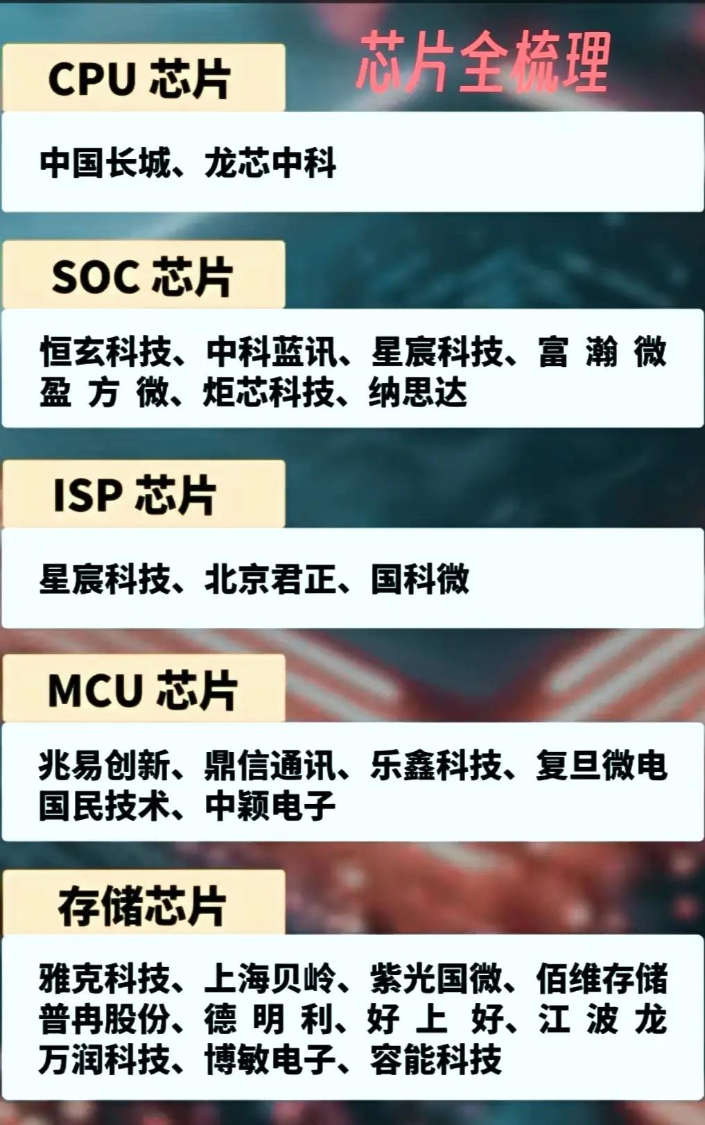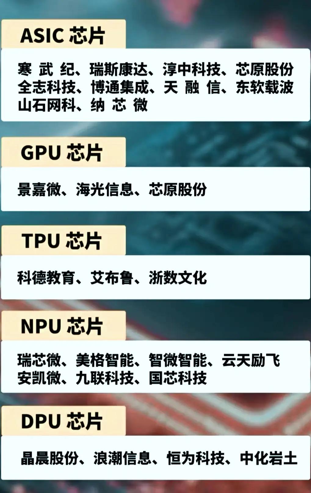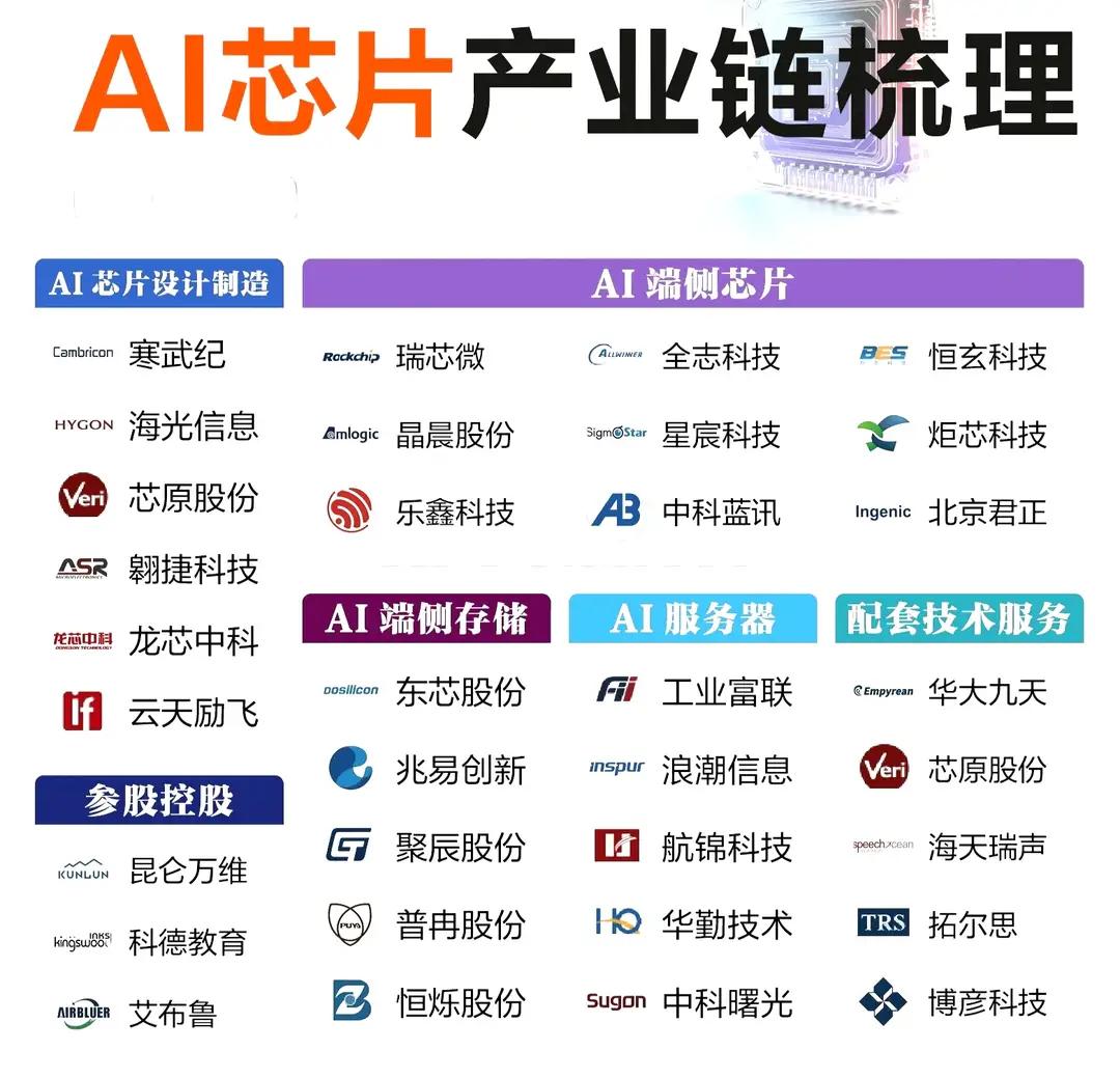 以下是对AI及各类芯片产业链相关信息的总结: 1. AI芯片产业链整体情况(第1张图)图片对AI芯片产业链进行了系统梳理,主要分为AI芯片设计制造、AI端侧芯片、AI端侧存储、AI服务器、配套技术服务、参股控股等板块。 - 在AI芯片设计制造环节,涉及企业众多,包括寒武纪、瑞芯微、全志科技、龙芯中科、北京君正、晶晨股份、炬芯科技、乐鑫科技、中科蓝讯、Ingenic、翱捷科技、海光信息、云天励飞、芯原股份、Veri、Backchip、Amlogic、HYGON、工业富联等。这些企业多数为国内知名芯片设计或AI算力相关公司,部分带有企业LOGO展示。 - 其它板块如AI端侧存储、AI服务器、配套技术服务等,也列举了一些相关企业,例如:东芯股份、普冉股份、兆易创新、聚辰股份、恒烁股份、浪潮信息、中科曙光、华勤技术、拓尔思、博彦科技、海天瑞声、航锦科技、科德教育、艾布鲁等,涵盖存储、服务器硬件、数据服务与软件配套等领域。 2. 各类传统与专用芯片分类梳理(第2张图)该图以“芯片全梳理”为主题,按芯片类型分类,并列出对应的主要国内企业,具体包括: - CPU芯片:代表企业为中国长城、龙芯中科。 - SOC芯片(系统级芯片):包括恒玄科技、中科蓝讯、星宸科技、富瀚微、盈方微、炬芯科技、纳思达。 - ISP芯片(图像信号处理芯片):有星宸科技、北京君正、国科微。 - MCU芯片(微控制器芯片):主要包括兆易创新、鼎信通讯、乐鑫科技、复旦微电、国民技术、中颖电子。 - 存储芯片:该类别企业数量较多,有雅克科技、上海贝岭、紫光国微、佰维存储、普冉股份、德明利、好上好、江波龙、万润科技、博敏电子、容能科技等。 这些芯片类型覆盖了从中央处理、图形处理、信号处理、控制到存储的多个关键领域,相关企业多为国内半导体产业链的重要参与者。 3. 专用AI/计算类芯片及对应企业(第3张图)该图聚焦于不同种类的专用AI芯片,每种芯片类型下列举了相关代表性企业,包括: - ASIC芯片(专用集成电路芯片):如寒武纪、瑞斯康达、淳中科技、芯原股份、全志科技、博通集成、天融信、东软载波、山石网科、纳芯微。 - GPU芯片(图形处理器芯片,常用于AI训练与渲染):包括景嘉微、海光信息、芯原股份。 - TPU芯片(张量处理器,主要用于AI加速计算):有科德教育、艾布鲁、浙数文化。 - NPU芯片(神经网络处理单元,面向AI推理与边缘计算):如瑞芯微、美格智能、智微智能、云天励飞、安凯微、九联科技、国芯科技。 - DPU芯片(数据处理器,用于数据中心网络与存储卸载):包括晶晨股份、浪潮信息、恒为科技、中化岩土。 这一板块体现出当前国内在AI计算芯片多样化方向上的布局,覆盖从通用加速(GPU)、特定任务优化(ASIC、NPU)、AI训练(TPU)到数据流处理(DPU)等多个细分领域。 综合总结: 这三张图片共同构成了对当前中国AI及半导体芯片产业链较为全面的梳理,从宏观的AI芯片产业架构,到具体的芯片类型(如CPU、SOC、MCU、存储芯片等),再到面向人工智能计算的专用芯片(如ASIC、GPU、TPU、NPU、DPU),都分别列出了代表性的国内企业和产业参与者。内容既包括传统计算芯片,也突出了AI时代下新兴的计算与数据处理芯片,反映出中国在半导体与AI基础设施领域的广泛布局与细分发展。涉及的知名企业如寒武纪、龙芯中科、海光信息、晶晨股份、瑞芯微、兆易创新、浪潮信息、中科曙光、芯原股份等,在产业链中扮演着重要角色。