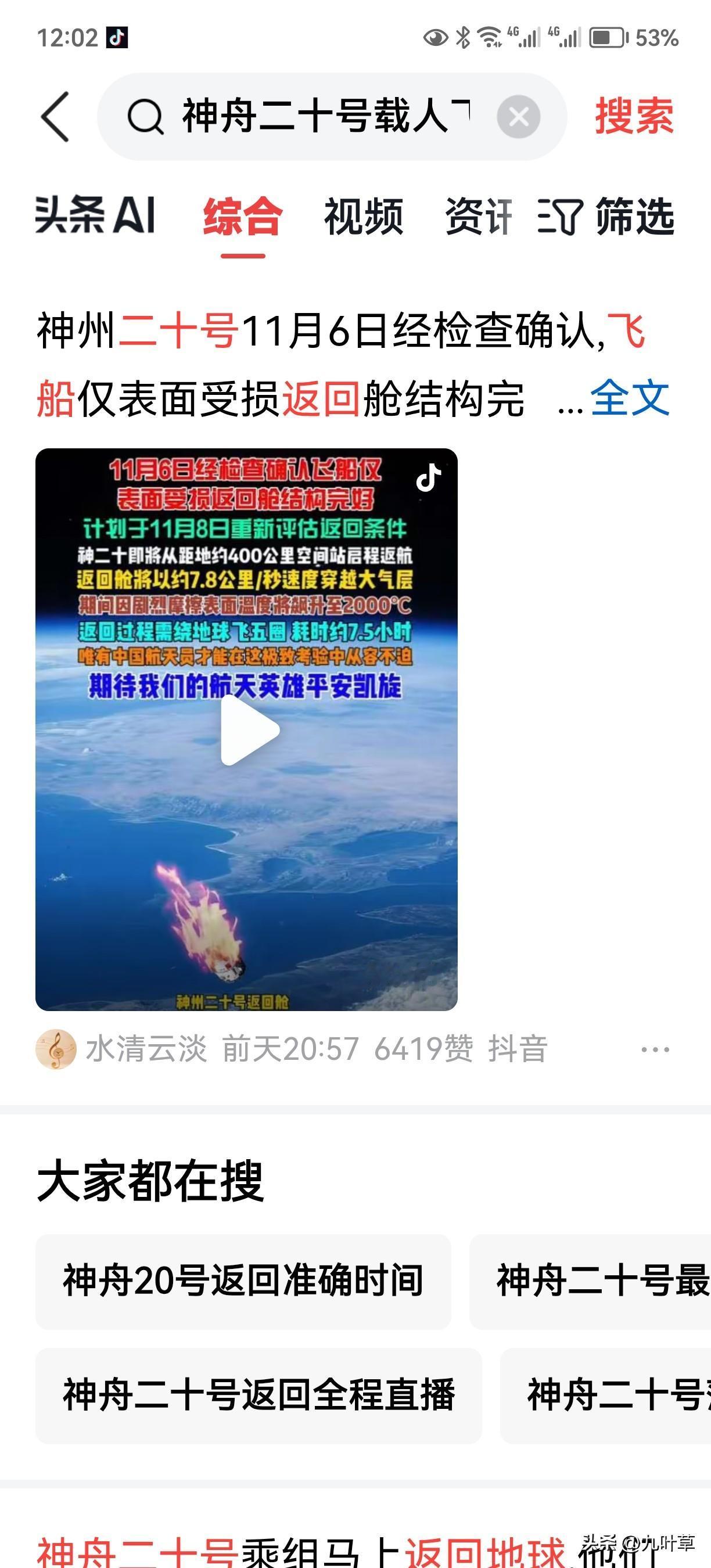 最新特别重大好消息! “神州二十号”即将启程返航! 于11月5日准备返回地面中, 因被微粒子太空垃圾撞击, 为确保航天员的安全, 航天指挥中心决定推迟返回, 11月8日, 经航天中心确认, 微粒子撞击仅仅击穿神州二十号表面, 不影响航天员安全返回, 航天中心已确认: 神州二十号将依自身返回地面, 不需要备用航天器进行救援! 如斯为甚, 国之强乎!中国神舟二十号 神舟二十问天 中国神舟19号 神舟二十 神舟20号 神州二十飞船 神舟二十號