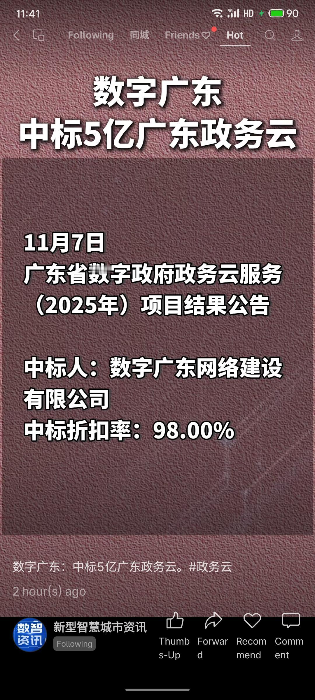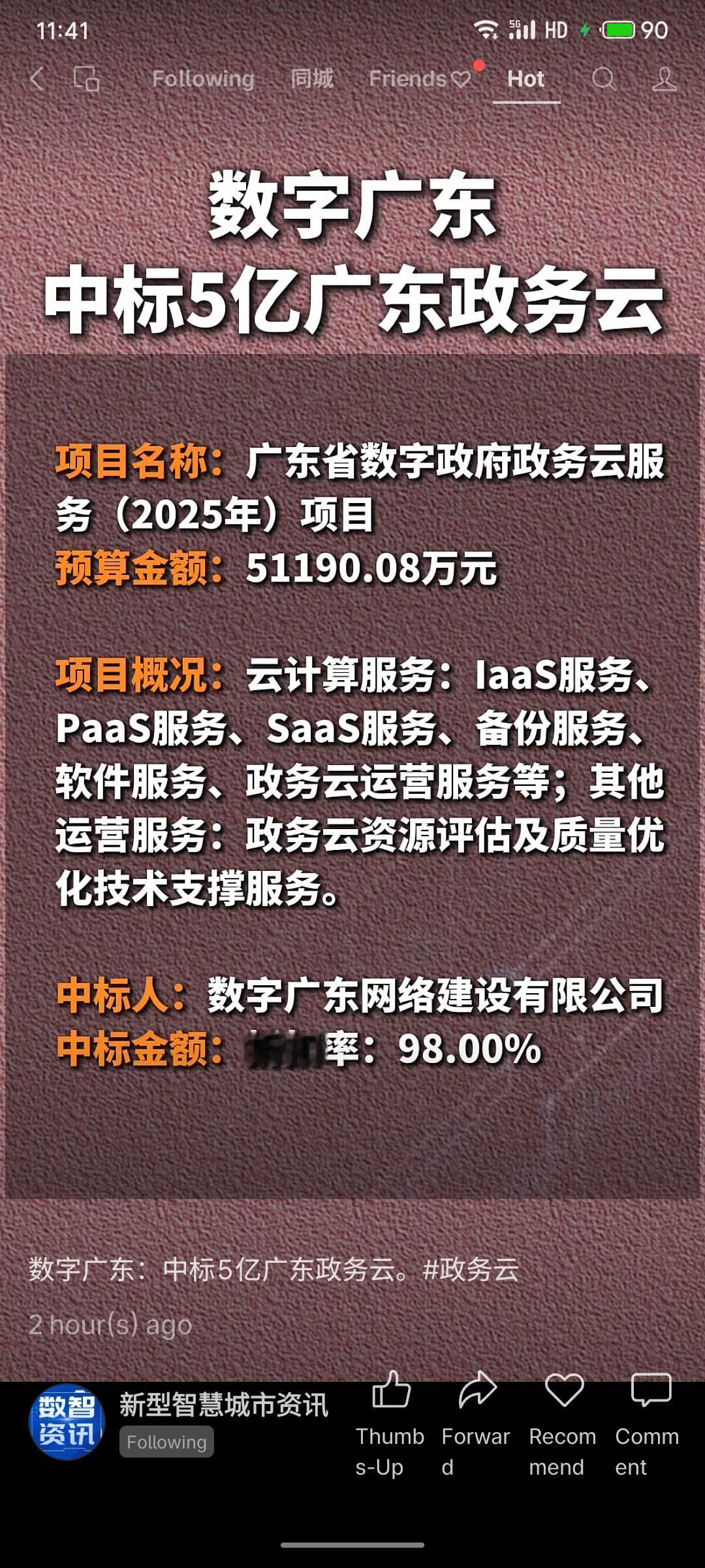 数字广东公司以98%折扣率中标广东省数字政府政务云服务项目。该项目预算约5.12亿元,主要提供云计算、备份及政务云运营等服务。