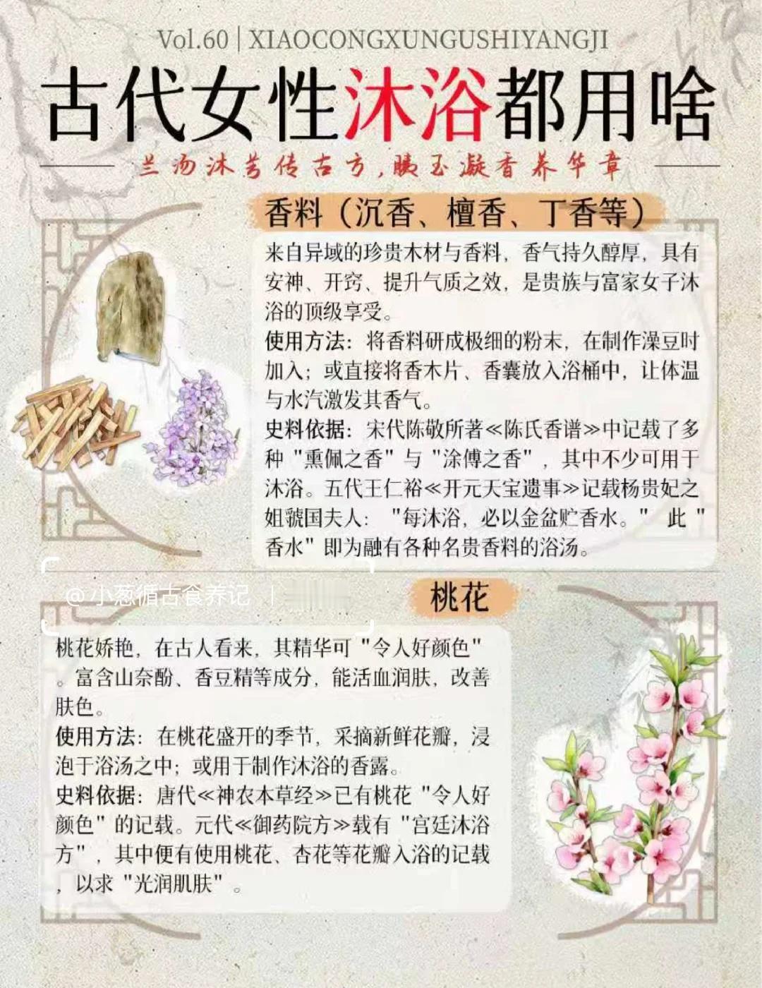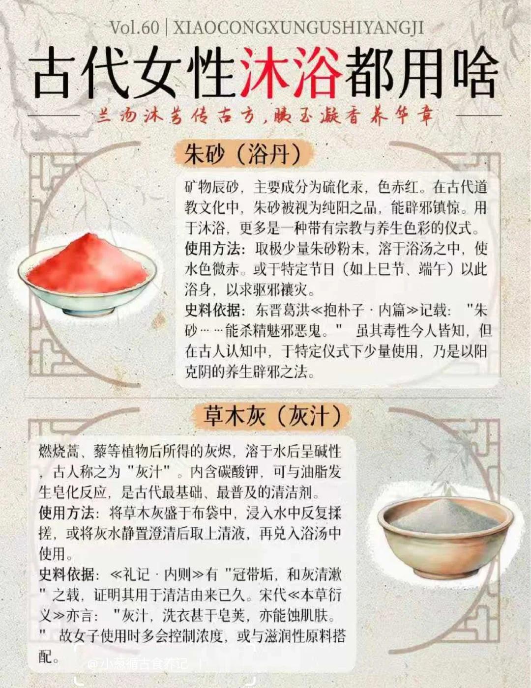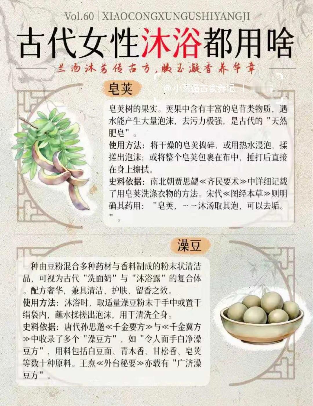 从兰汤到香露 | 古代女性沐浴都用啥? 在没有现代化工沐浴品的千年时光里,古代女子的洗护之道,是一场萃取自天然的智慧,更是一场充满仪式感的雅事。她们的沐浴,是“浴兰汤兮沐芳”,更是“梳洗罢,独倚望江楼”的风情。 这一期,小葱盘点了16种历史上真实存在的沐浴原料,每一味,都承载着一段馨香的历史,跟着我一起来看下吧: 1. 兰汤(佩兰/泽兰) 2. 淘米水 3. 皂荚 4. 澡豆 5. 藁本 6. 益母草 7. 香料(沉香、檀香、丁香等) 8. 桃花 9. 稻糠 10. 草木灰(灰汁) 11. 朱砂(浴丹) 12. 白芷 13. 茅香 14. 冬瓜汁 15. 胰子(澡豆的升级版) 16. 茯苓 这十六味沐浴古方原料。从寻常的淘米水、草木灰,到风雅的兰汤、香药,再到带有神秘色彩的朱砂,古代女子的沐浴文化,实则是一部微缩的中国物质生活史、科技史与观念史。她们不仅洗净身体,更在氤氲香气中,完成了对美的塑造、对健康的追求,乃至与天地神灵的沟通。[偷笑] 传统文化 古人的生活 沐浴 古人的浪漫 古代生活美学 古人智慧 趣味知识科普 冷知识科普 古代传统文化