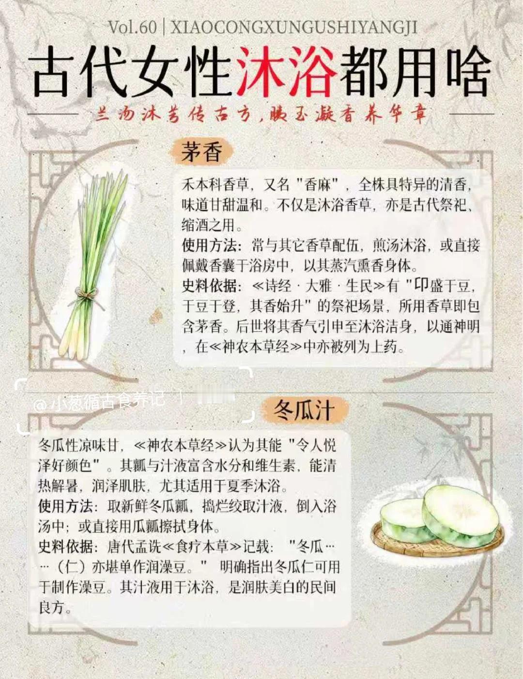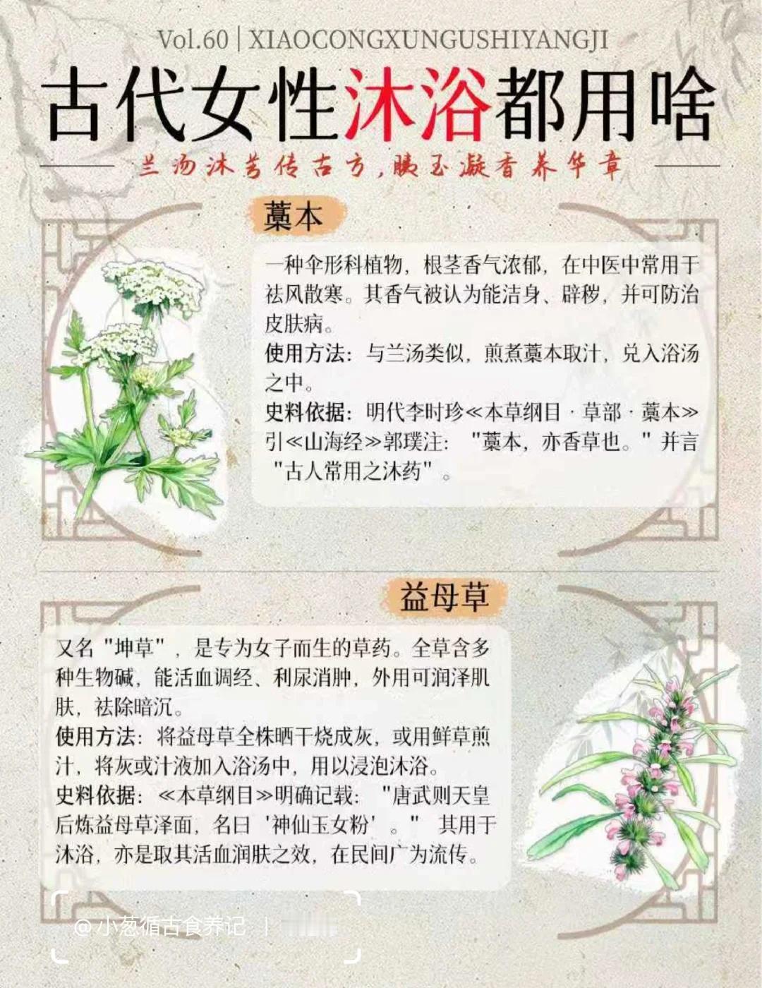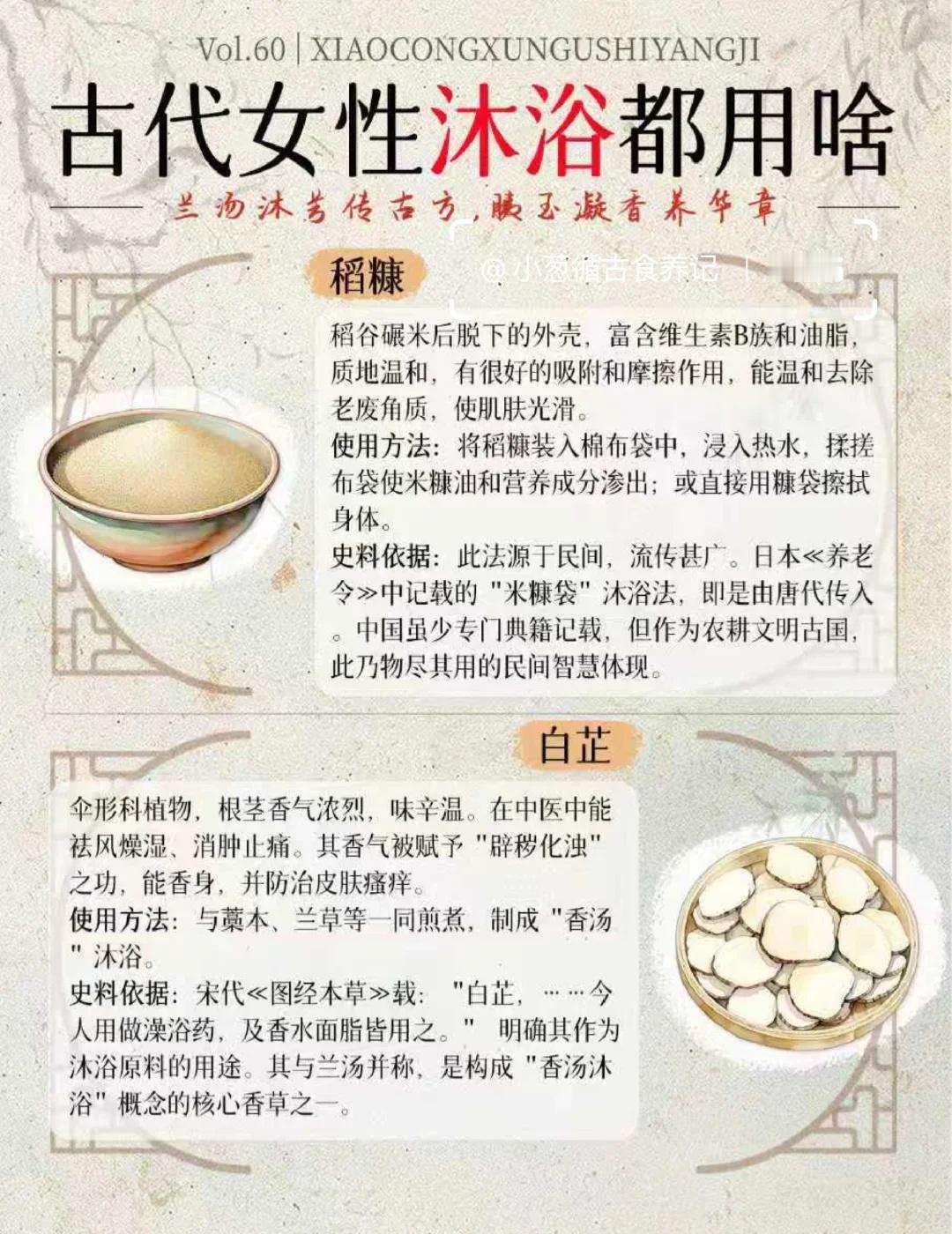 从兰汤到香露 | 古代女性沐浴都用啥? 在没有现代化工沐浴品的千年时光里,古代女子的洗护之道,是一场萃取自天然的智慧,更是一场充满仪式感的雅事。她们的沐浴,是“浴兰汤兮沐芳”,更是“梳洗罢,独倚望江楼”的风情。 这一期,小葱盘点了16种历史上真实存在的沐浴原料,每一味,都承载着一段馨香的历史,跟着我一起来看下吧: 1. 兰汤(佩兰/泽兰) 2. 淘米水 3. 皂荚 4. 澡豆 5. 藁本 6. 益母草 7. 香料(沉香、檀香、丁香等) 8. 桃花 9. 稻糠 10. 草木灰(灰汁) 11. 朱砂(浴丹) 12. 白芷 13. 茅香 14. 冬瓜汁 15. 胰子(澡豆的升级版) 16. 茯苓 这十六味沐浴古方原料。从寻常的淘米水、草木灰,到风雅的兰汤、香药,再到带有神秘色彩的朱砂,古代女子的沐浴文化,实则是一部微缩的中国物质生活史、科技史与观念史。她们不仅洗净身体,更在氤氲香气中,完成了对美的塑造、对健康的追求,乃至与天地神灵的沟通。[偷笑] 传统文化 古人的生活 沐浴 古人的浪漫 古代生活美学 古人智慧 趣味知识科普 冷知识科普 古代传统文化