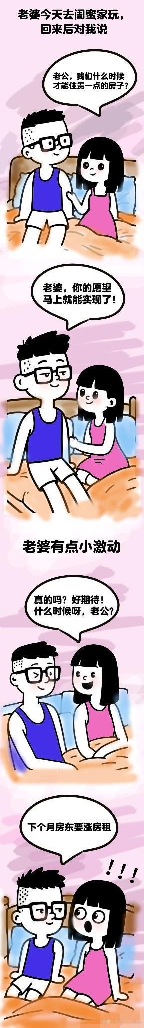 趣味漫画:老婆今天去闺蜜家玩,回来后问我:老公我们什么时候才能住贵点的房子?我说:老婆,你的愿望很快就能实现了。……