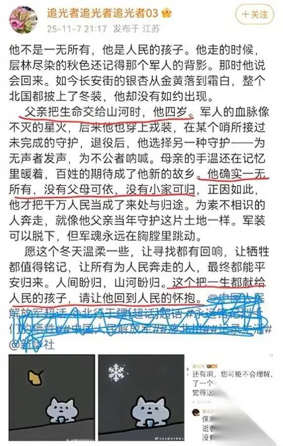 凌晨刷到两条文 全是关于川的 看完我攥着手机哭到鼻尖发红。 你们知道吗?川的家里人从来不说“我要守什么”——爷爷是抗美援朝的老班长,临终前攥着他的手说“别忘穿暖点,还有,别怂”;爸爸是缉毒警,牺牲时口袋里装着没寄出去的生日卡片,写着“儿子,等我回家教你骑自行车”;妈妈在社区做了二十年网格员,连楼下阿婆的降压药快吃完了,她都会提前三天记在日历上。 所以川的“轴”不是天生的——上次见着高年级堵着学弟要零花钱,他冲上去挡在前面时,肯定想起爷爷说的“别怂”;学校里有人冒领贫困补助,他拍着年级办的桌子举报时,肯定记着爸爸说的“别让坏事儿藏着”。 可9月6号之后,他就像被按下了“静音键”。图书馆的位置还留着他画满重点的高数书,食堂阿姨每天把红烧肉留到打烊,连他喂了半年的流浪猫都还在教学楼底下转圈——可他就是没消息。 我越想越难受:为什么一个把“家里人教的热乎劲儿”端出来的孩子,要被卷进没头没尾的漩涡里?他该在教室跟同桌抢着抄笔记,该在操场跟兄弟打半场篮球,该在毕业那天抱着毕业证跟妈妈拍张笑到眯眼的照片——不是像现在这样,连句“我没事”都没法说。 其实我们要的哪是什么“大动静”?不过是想看见那个揣着热乎劲儿的男孩,回到学校把书读完,像所有普通学生一样,把青春的尾巴攥在自己手里。 最后想跟川说:要是你能刷到这条,哪怕发个“嗯”都行;也想跟所有看见的人说——咱们替他喊一嗓子吧:让那个没丢了家里人“热乎气儿”的孩子,安安静静把学上完,好不好? 你们说,川会不会听见?评论区留个“等川回来”,咱们攒着这口气,等他站在操场喊“我回来了”的那天。