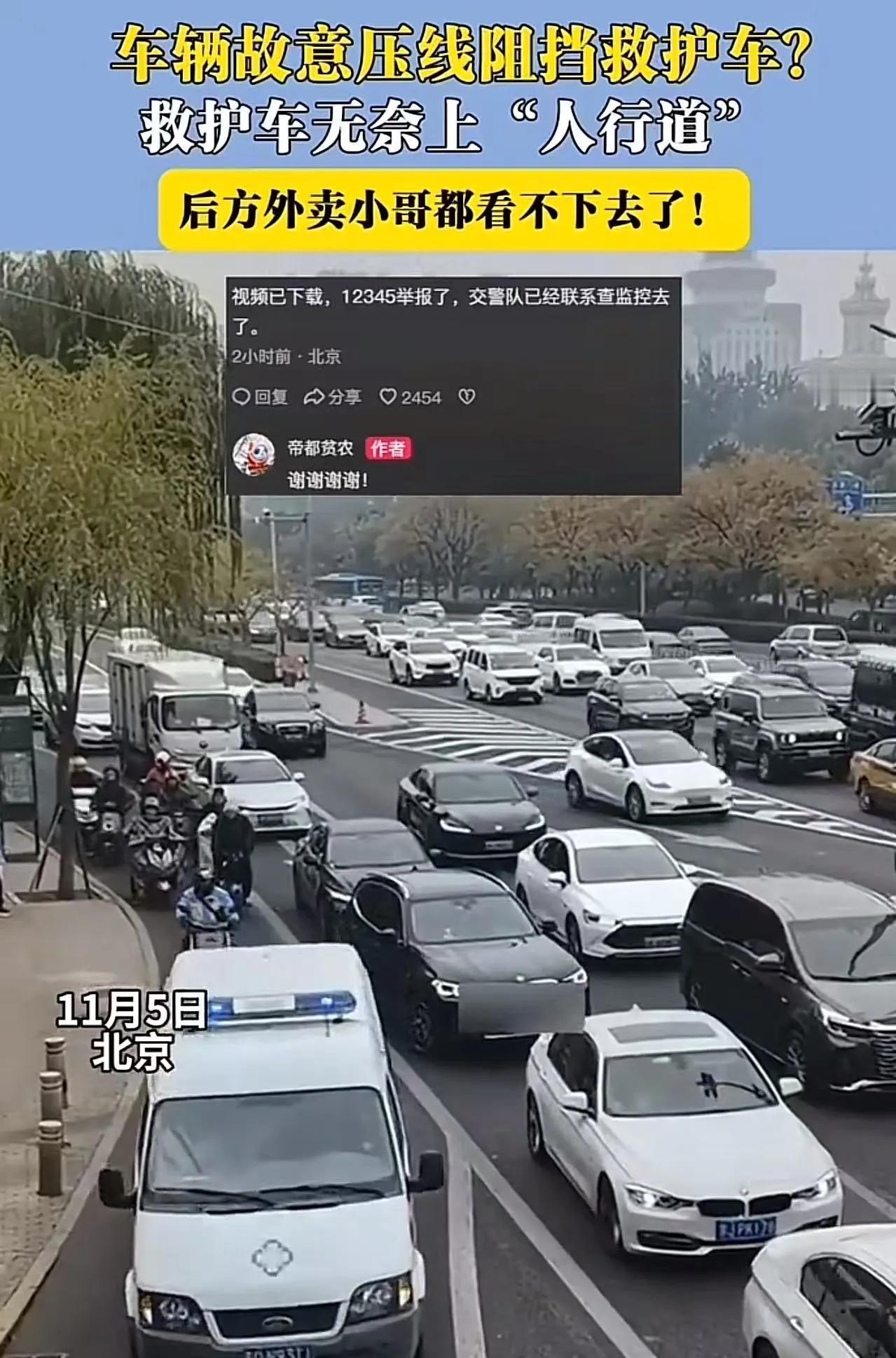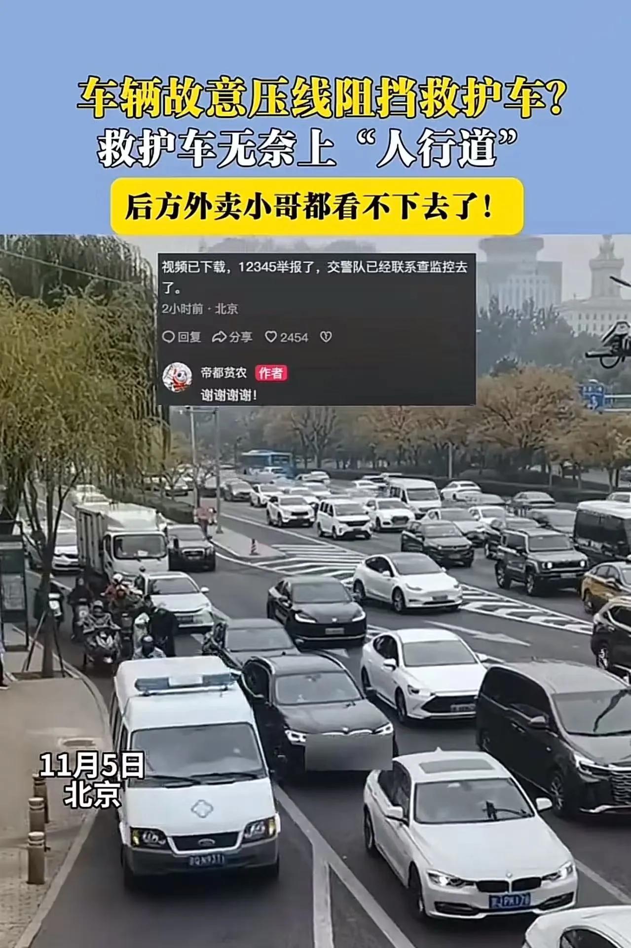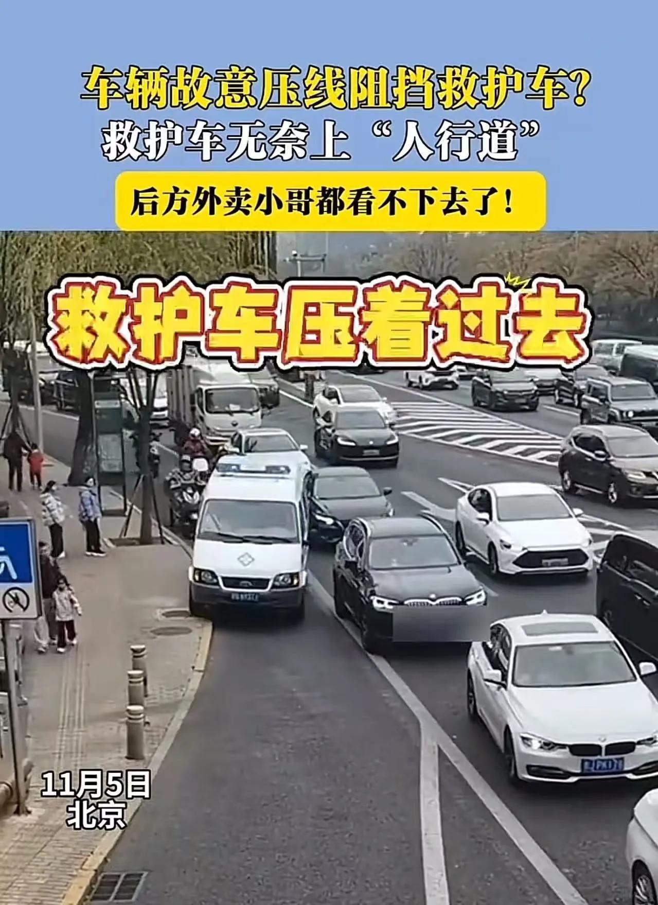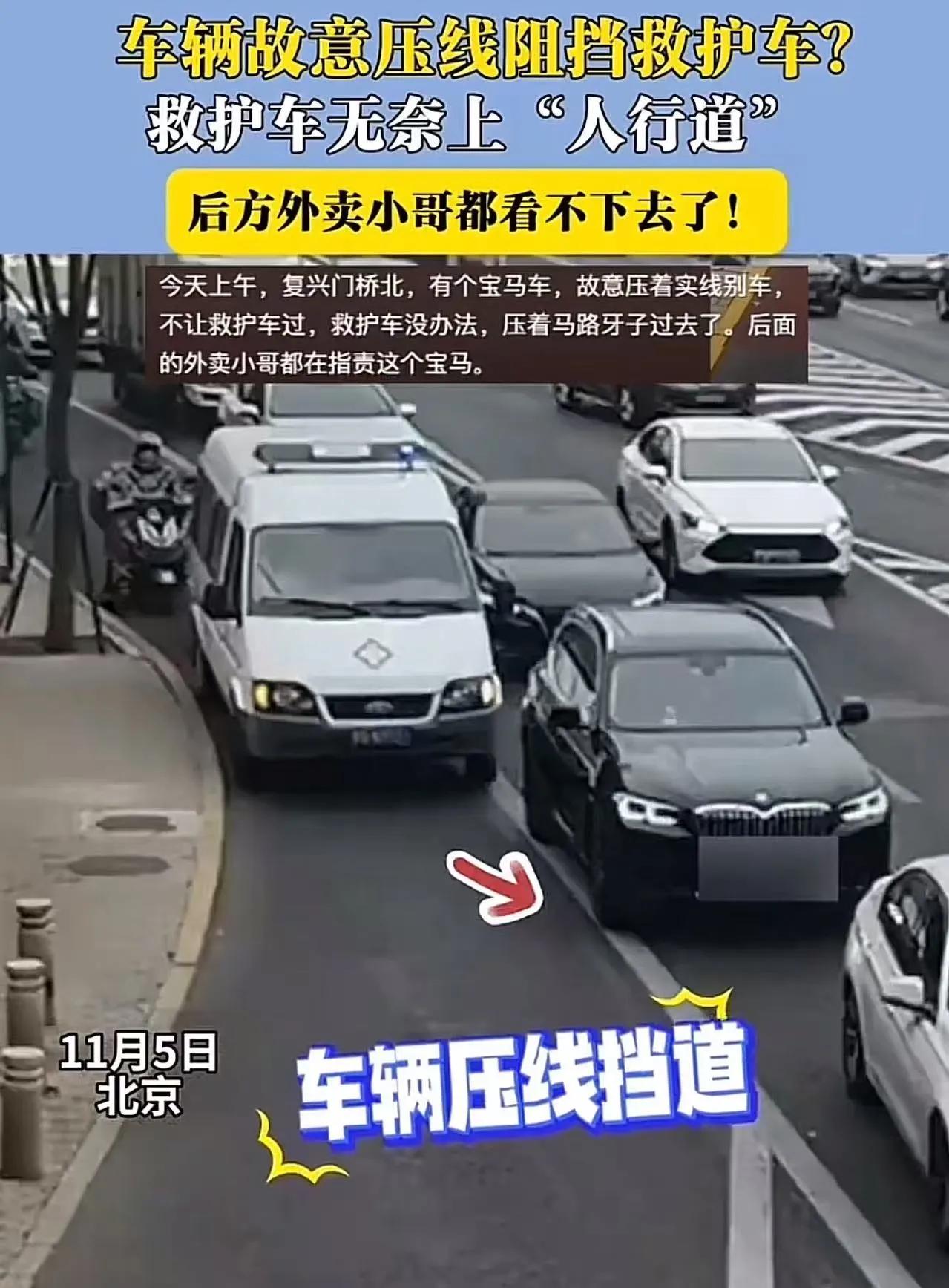 “压实线堵救护车,宝马司机被狂喷!”北京某路口,救护车警笛长鸣,却被一辆宝马车压实线死死挡住,任凭喇叭怒吼纹丝不动,最终救护车被迫骑上人行道颠簸通过;行车记录仪里,宝马随后潇洒回正车头,全程行云流水。网友:这不是没听见,这是坏透了! 据大象新闻报道,事发北京主干道早高峰,救护车亮灯鸣笛执行急救任务,途经路口时,前方黑色宝马突然向右压实线停靠,完全阻断去路,救护车连续按喇叭近三十秒,宝马车始终未挪动。 救护车司机无奈,只得冒险打方向,让车轮碾上人行道马路牙子,车身颠簸通过;后方外卖骑手目睹全程,怒指宝马“就是故意”,并将行车记录仪视频上传网络,引发热议。 监控显示,救护车刚驶过,宝马便平稳回正车头,压实线动作瞬间消失,仿佛计算好时间,后方车辆镜头记录全过程,视频曝光后点击量迅速攀升。 交管部门当日介入,认定宝马驾驶人故意妨碍执行紧急任务的救护车,依法处以罚款200元、记3分,并通报其所在单位;处罚通报下,网友仍排队呼吁“挡救命车就该拘留”,警示所有道路参与者主动避让特种车辆。 对于这件事情,大家有什么看法?高速让救护车 医院救护车护送