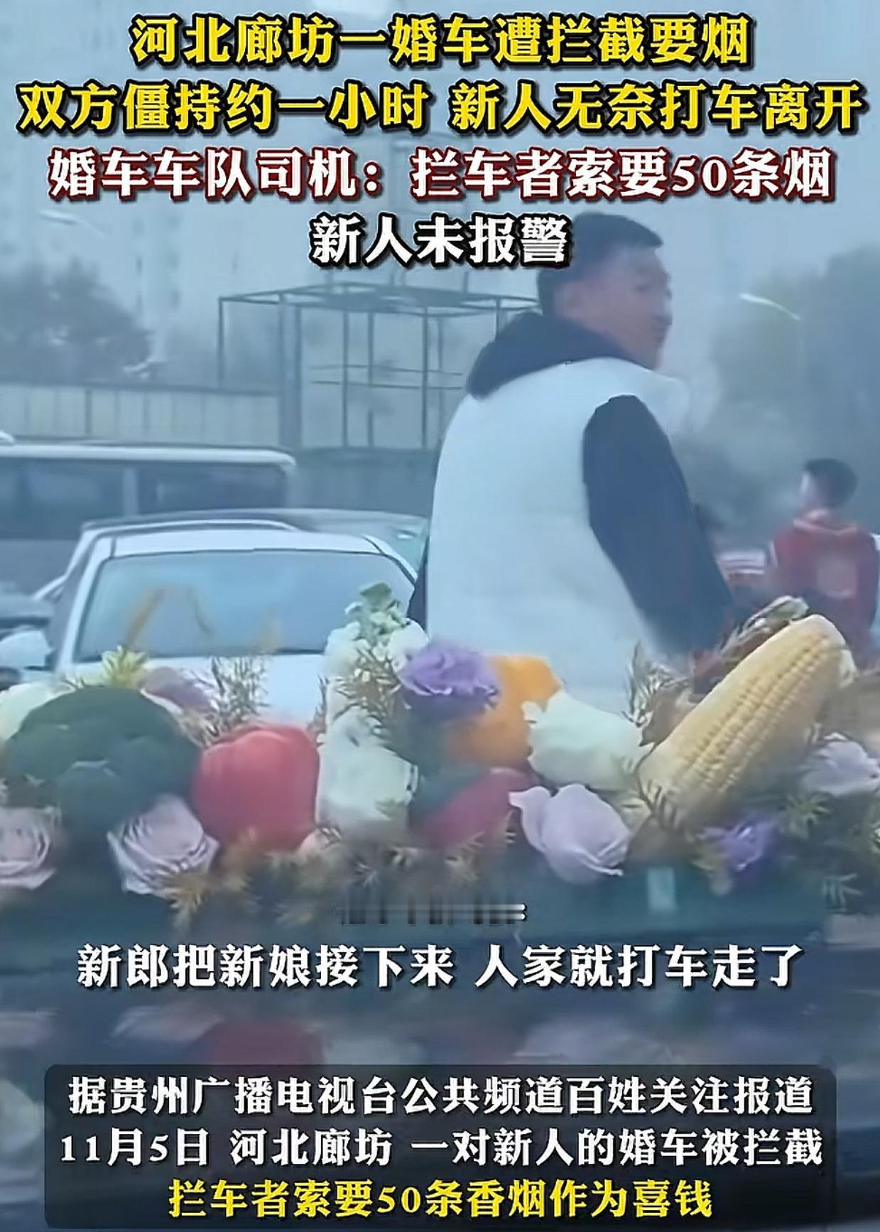 所谓的讨喜,其实就是拦路抢劫! 说实话,已经很久没听到拦婚车的事了。现在结婚率,生育率这么低,如果任由这帮让这么干,年轻人更不敢结婚了。 11月5号河北廊坊的拦婚车事件,说实话和拦路抢劫没什么区别,大家要是都这样干,一路都拦下去,那婚也不用结了。 现在结个婚这么不容易,还干这种事。还起个讨喜的借口,拿人家新人结婚当儿戏,支说讨喜,咋不说给红包呢。