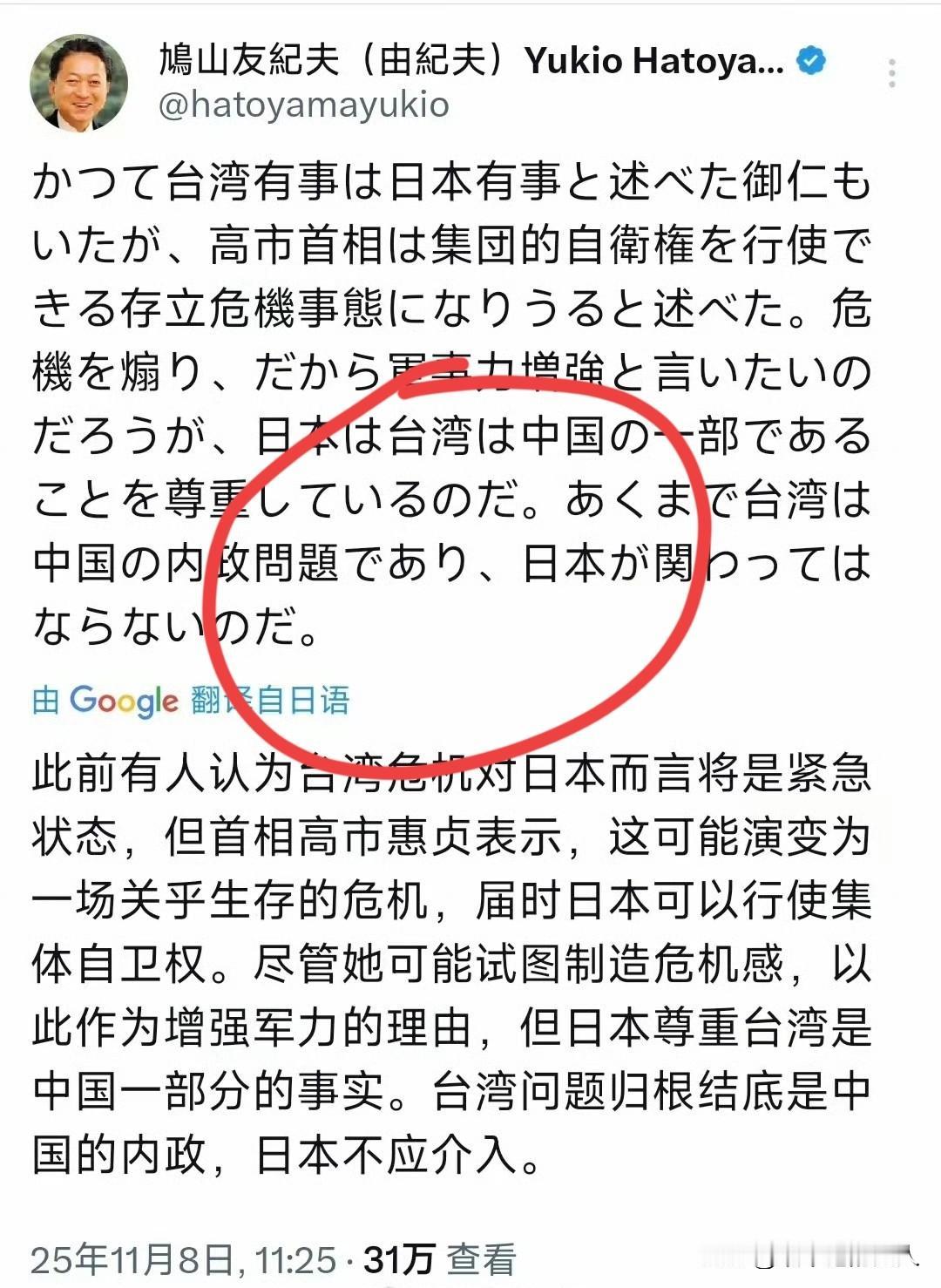 顶一个! 鸠山由纪夫紧急发帖:台湾问题归根结底是中国的内政,日本不应该介入! 很显然,这是他对高市早苗前几天在日本众议院委员会上不当言论(图三)的批评!也算真正的把高市早苗的意图看透了! 这个时候鸠山由纪夫站出来提醒一下她,即是告诉日本老百姓高市早苗有可能带领日本在错误的道路上越走越远,也是对站在悬崖边的她紧急拉一把,否则,掉下去还不摔成肉酱?[捂脸]