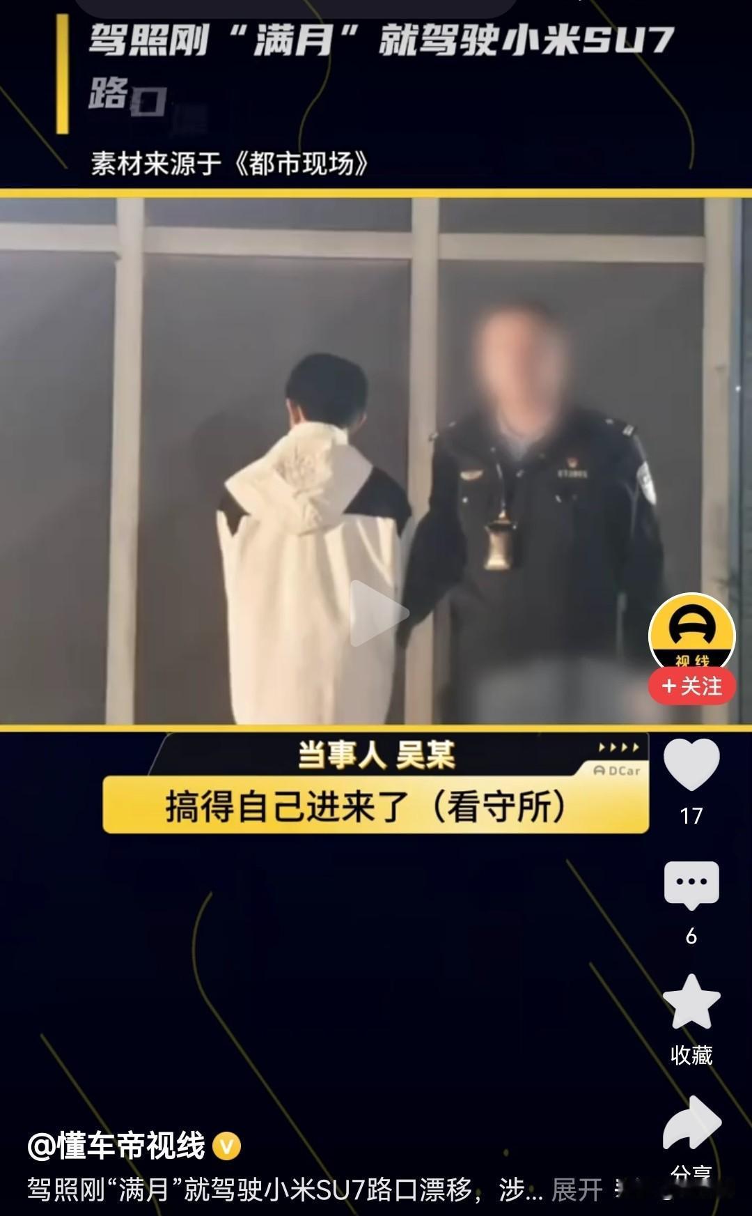 一小伙刚拿驾照“满月”就驾驶租来的小米SU7路口漂移被刑拘! 他开车经过4个路口,总共漂移11次! 最让人无语的事,他被抓了之后在看守所接受采访时他还说 “这么小的一件事,结果把自己搞进来了”! 有时候对于这些人我都不知道说什么好,在路口玩漂移,而且还是多次漂移,已经严重危害公共安全,直接无视交通法,在他们眼里只算小事? 被拘留10天,我觉得这样的处罚真的太轻了! (信息来源:江西都市现场) 小米SU7