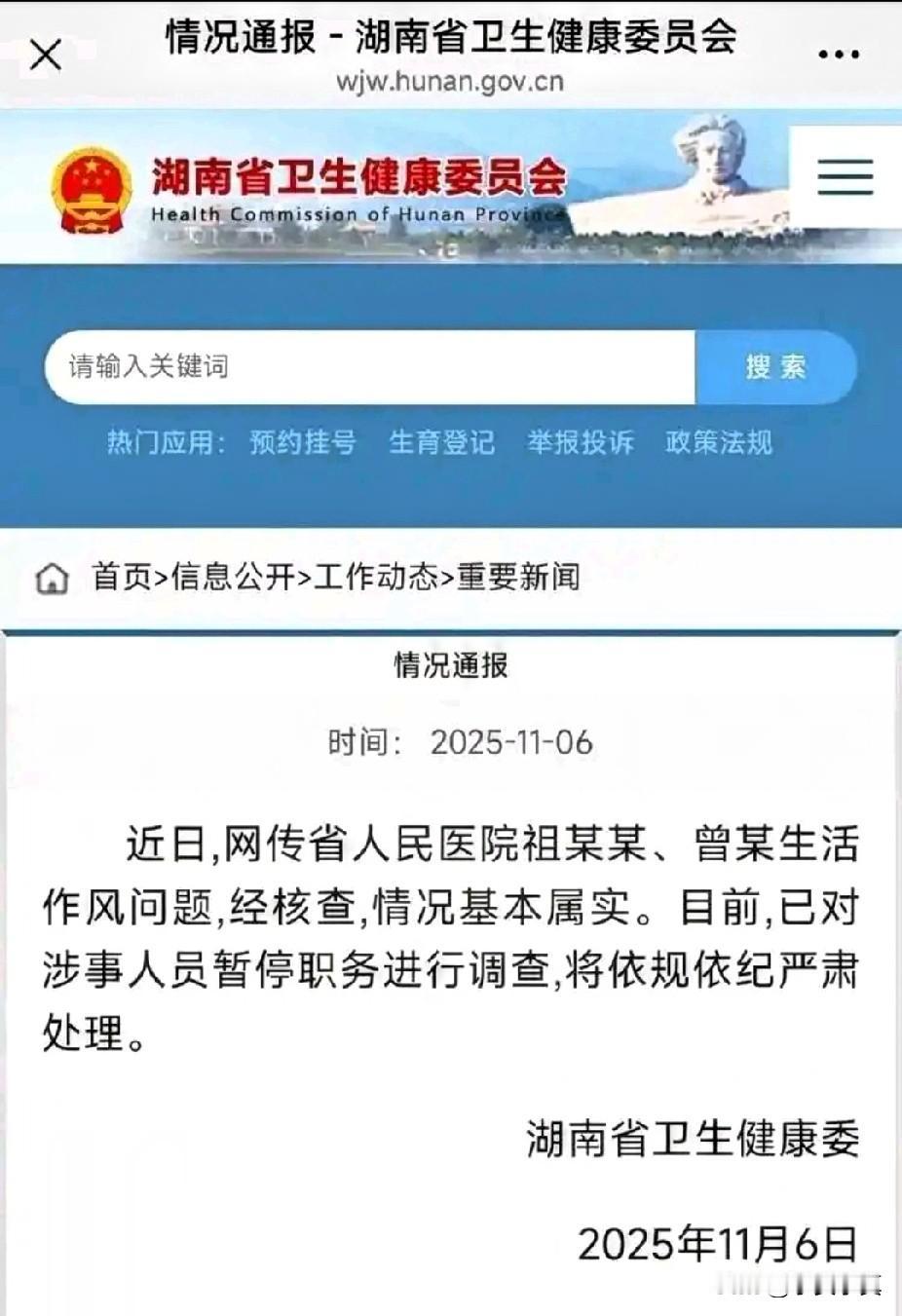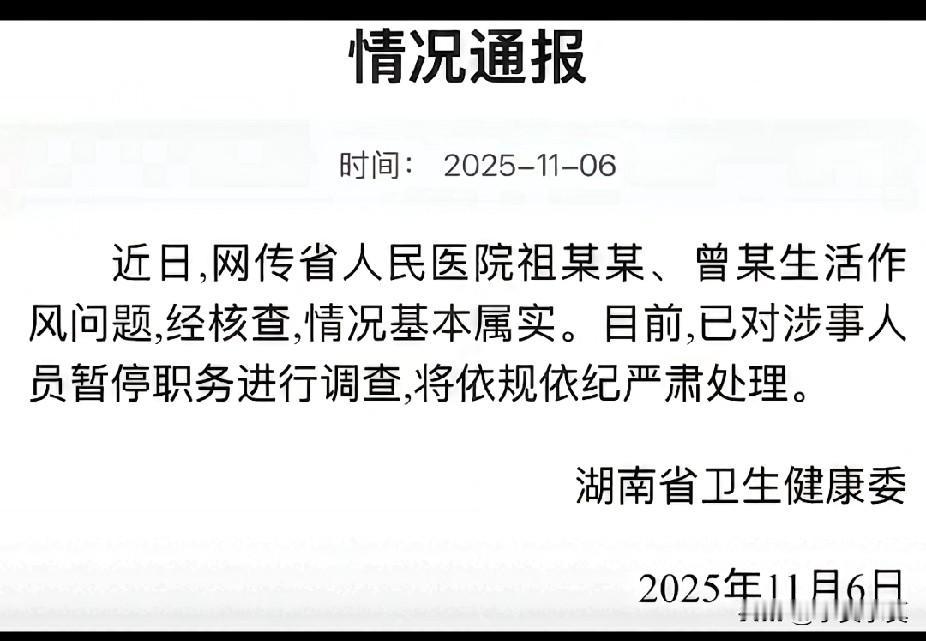 破案:三甲医院副院长与眼科主任办公室放纵,做唉现场是谁提供的? 11月5日,湖南省人民医院因一则重磅爆料冲上热搜顶端,泌尿外科副院长祖某与眼科副主任曾某的职场丑闻引发全网热议。这场风波的导火索,是一段在网络上疯传的17分钟不雅视频,画面清晰记录了二人于2025年8月18日下午,在医院值班室发生亲密行为的全过程。 作为医疗界的资深精英,二人的履历曾是行业标杆。祖某身兼教授、博导、博士后合作导师多重头衔,是泌尿科领域的权威专家;曾某同样手握博士学位,以主任医师、副教授身份担任眼科门诊副主任,亦是硕士研究生导师。然而,光鲜的学术光环背后,却是违背公序良俗的不正当关系,让公众对医疗从业者的职业操守产生质疑。 风波发酵后,医院内部的变动已悄然发生。门诊工作人员透露,曾某的门诊接诊已被暂时取消,"未来很长时间可能都不会放号";而祖某早在三周前就已停诊,具体原因始终成谜。院方随后披露的时间线显示,这场丑闻并非突发——三个月前就有传言称祖某与同院实习生关系暧昧,11月7日家属持聊天记录向纪检部门正式投诉,短短48小时后,医院便紧急暂停二人诊疗资格并启动专项调查,长沙市卫健委也已同步介入监督。 目前,二人已被暂停相关职务,等待进一步调查结果。此事引发的讨论远不止于桃色新闻本身:当医疗精英背离职业准则,利用职场便利发展不正当关系,不仅辜负了患者的信任,更玷污了医疗行业的公信力。有网友犀利吐槽:"有些人在外寻欢作乐,回家却对妻子冷若冰霜,连基本的家庭责任都抛之脑后,这样的人如何能担当医者仁心的使命?" 医疗行业的特殊性,要求从业者不仅要有精湛的医术,更要有高尚的医德。这场风波为所有职场人士敲响警钟:无论身处何种高位、手握多少光环,一旦触碰道德底线、违反公序良俗,终将被舆论反噬,付出应有的代价。目前调查仍在进行中,公众期待相关部门能给出公正透明的处理结果,还医疗行业一片清朗。 院长和眼主任应该知道谁是发布者了,现场是谁的办公室,谁是邀请人和被邀请人不就一目了然了