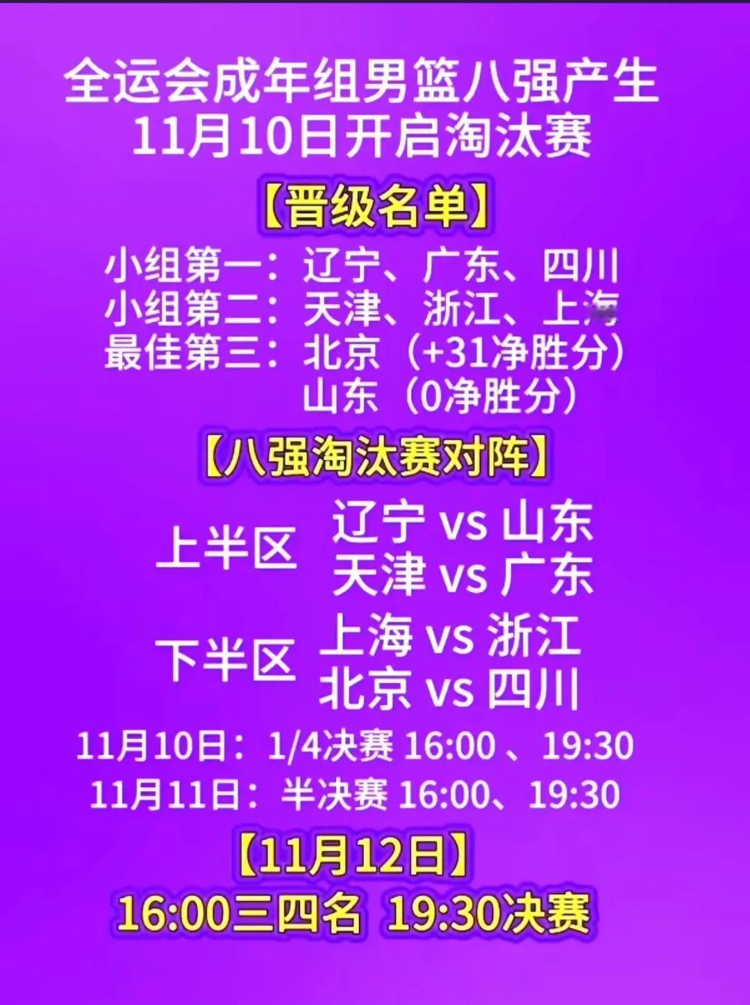 全运男篮八强。 上半区:广东VS天津,辽宁VS山东。 下半区:四川VS北京,浙江VS上海。 广东进入决赛问题不大,四川能不能跟广东队会师呢?观众期待着,毕竟他们也大牌云集,想看这两队的球迷比较多,强强碰撞哪个不喜欢看。 昨晚小组赛广东28分大胜浙江,不要以为浙江弱,说不准还能打进决赛呢? 其实浙江赛程更好,跟广东同一小组,淘汰赛却能避开,打其他队都有获胜把握的。