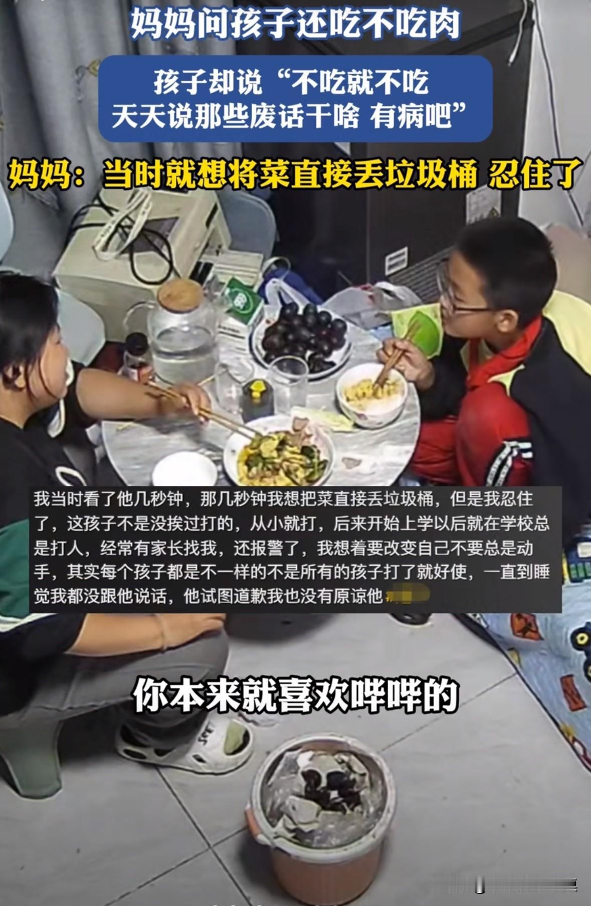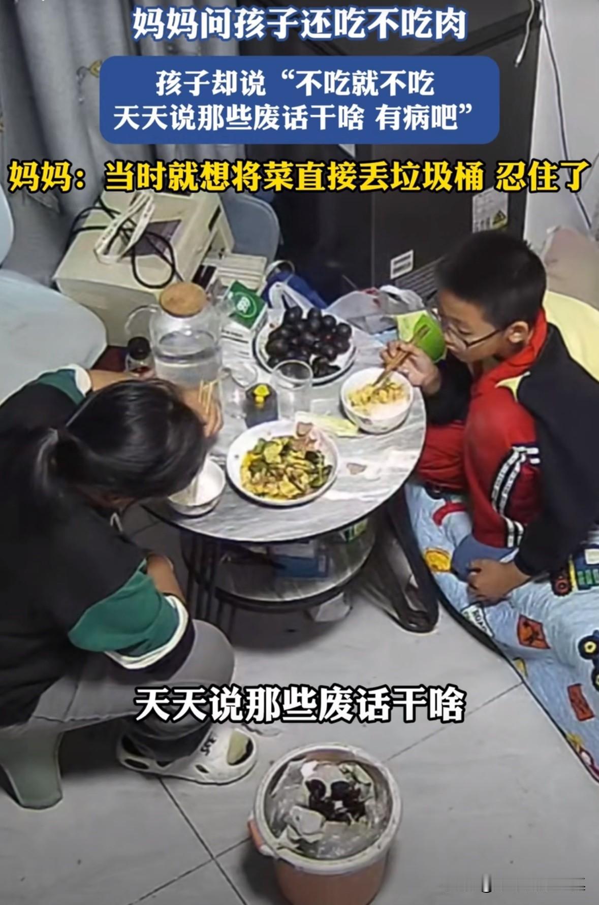 妈妈问儿子还吃不吃肉,儿子说:“不吃就不吃,天天说那些废话干啥,有病吧!” 妈妈也没有生气:“看给你牛的,你再说一句我听听!” 儿子:“你每天就喜欢逼逼!” 妈妈耐心解释:“你这是跟妈妈说话的语气吗?我问你吃不吃肉是关心你。” 儿子不耐烦的说:“我是懒得吃,我说好几遍了,你听不懂啊!” 这教育真失败,孩子完全不懂的尊重自己的妈妈。 如果是我儿子,饭都别想吃,我直接都摔了,一个月都不理他。儿子不尊重妈妈